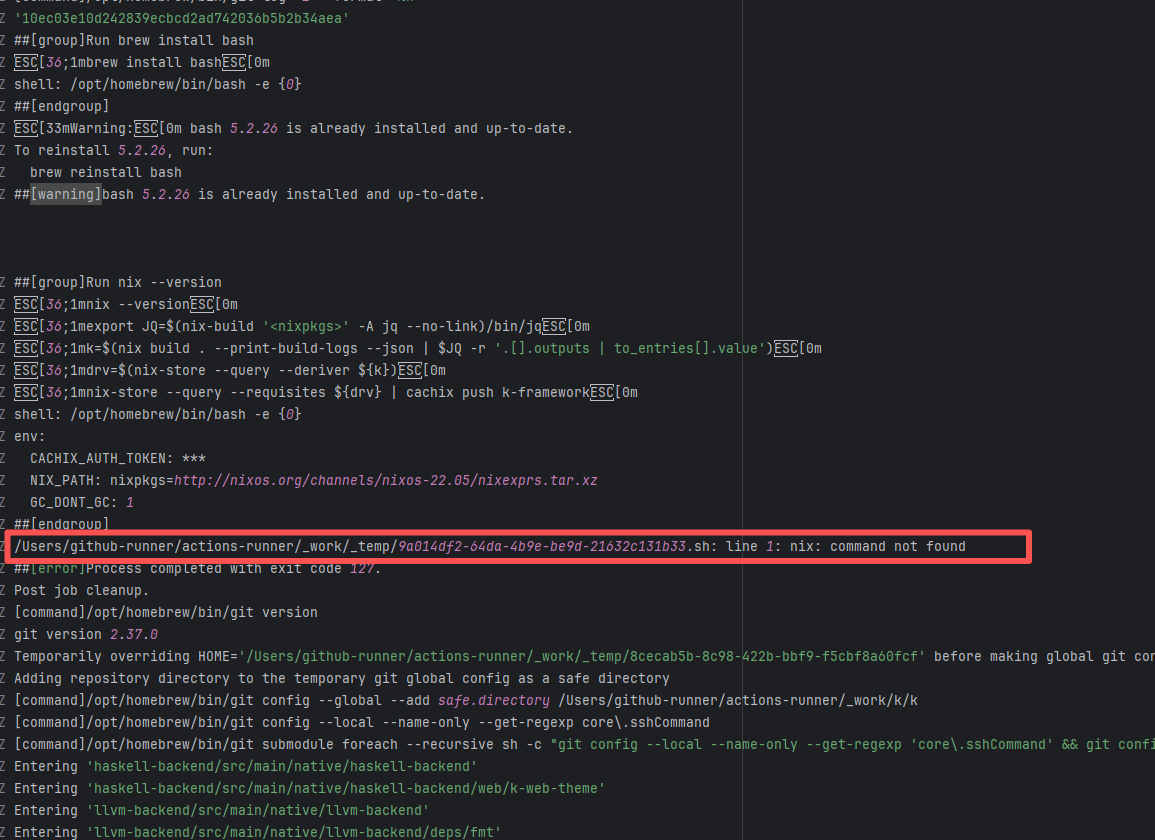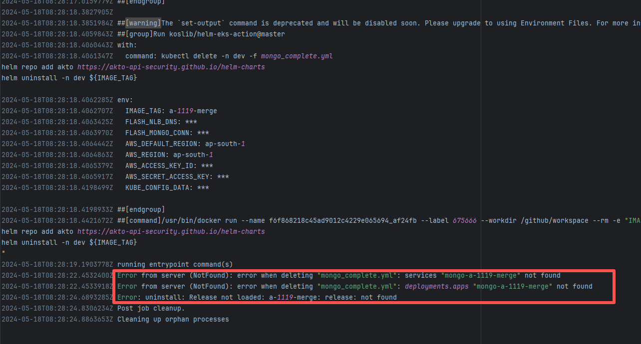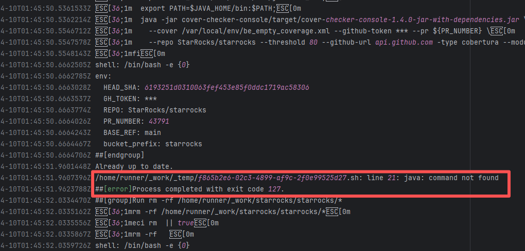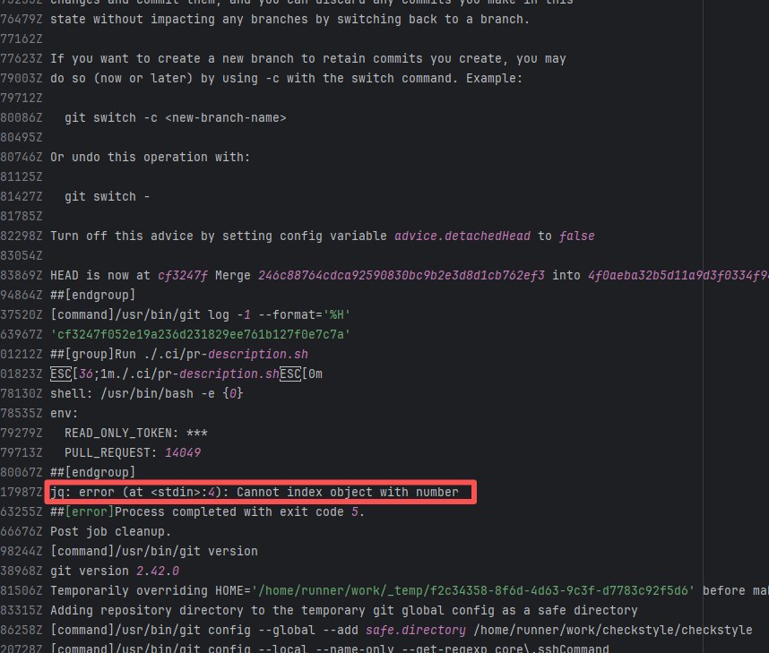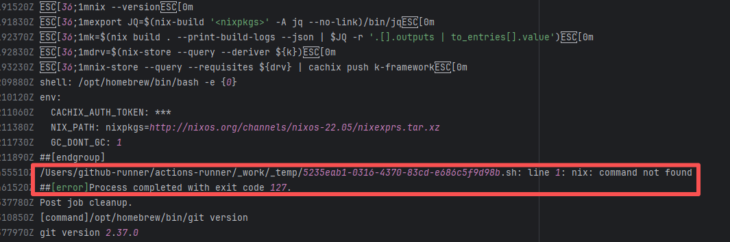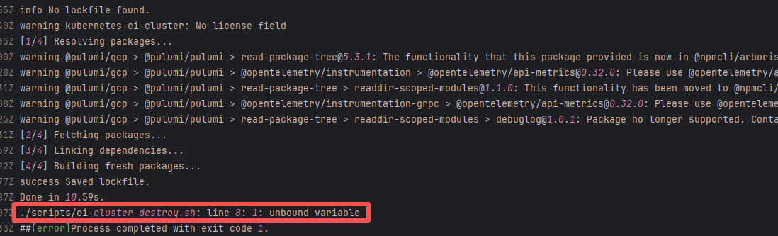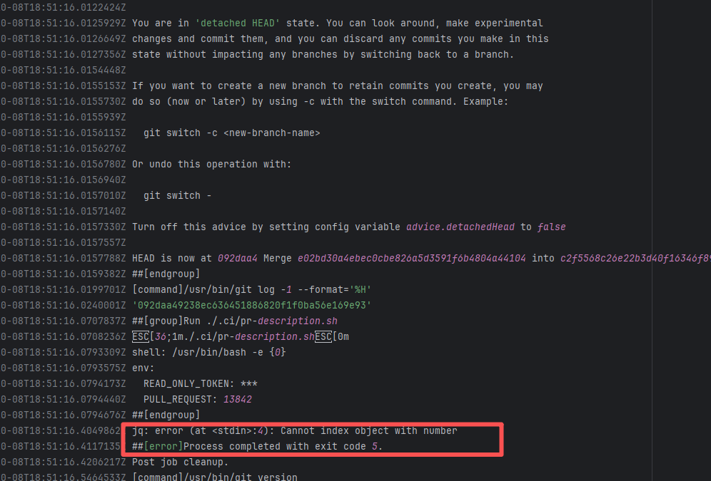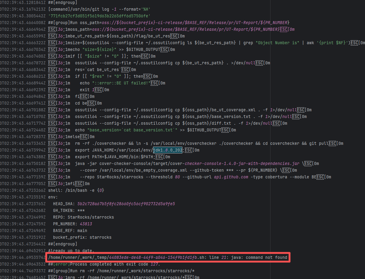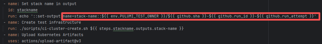 Error: The log error shows that the script referenced an undefined variable during execution. Root Cause: Comparing the success and failure logs reveals that the error is caused by outdated action commands, and this error is sporadic. The command in a certain step referenced the output of a previous step, echo '::set-output name=stack-name::${{ env.PULUMI_TEST_OWNER }}/${{ github.sha }}-${{ github.run_id }}-${{ github.run_attempt }}', but ::set-output has been deprecated. The echo command itself will still execute successfully (exit code = 0), so the workflow will not fail directly because of it, but the output of that step (${{ steps.id.outputs.xxx }}) will be empty, causing an error or logic error when referenced in subsequent steps. Succeeded after rerun. |