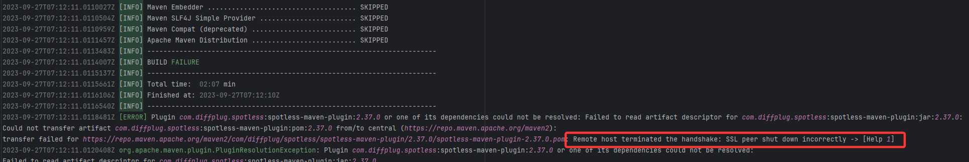 Error: Remote host terminated the handshake indicates that while downloading from the Maven central repository, Root Cause: The download operation was successfully executed after a rerun. |