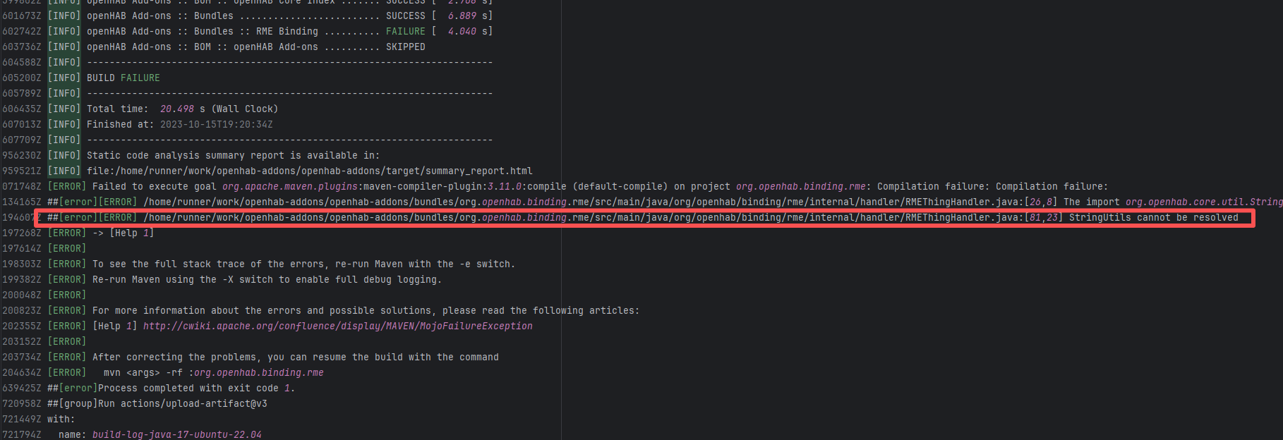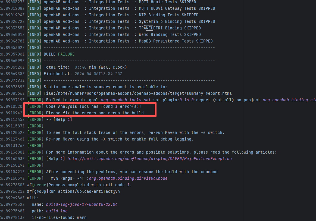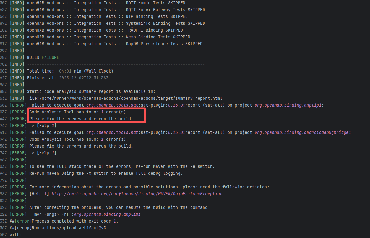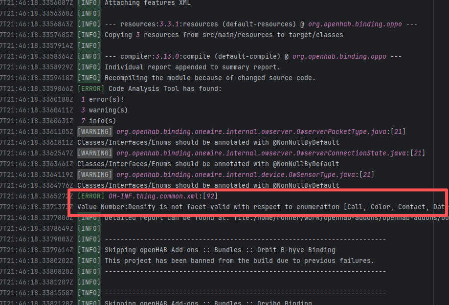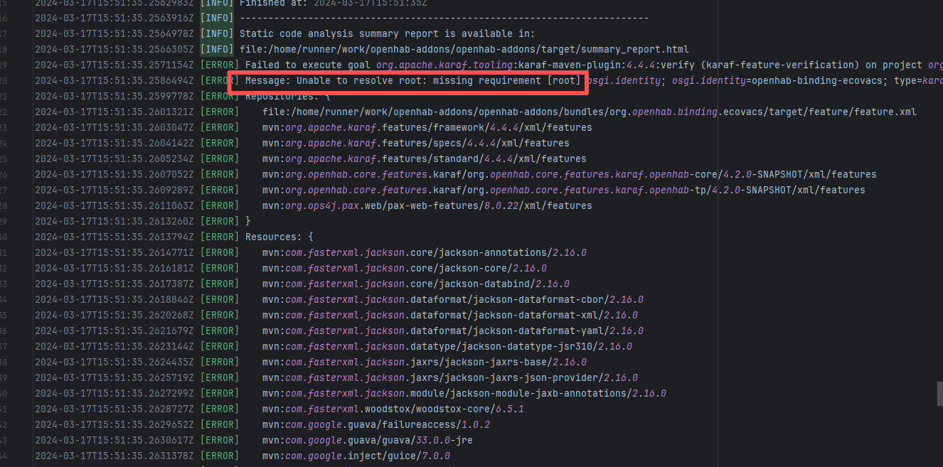 Error: The error occurred when building the OpenHAB binding org.openhab.binding.ecovacs using the Karaf Maven plugin. The issue occurred during feature resolution, specifically due to missing dependencies or the inability to resolve dependencies, causing the build to fail. Root Cause: Succeeded after a rerun, which indicates that the error is a transient error caused by network fluctuations. |