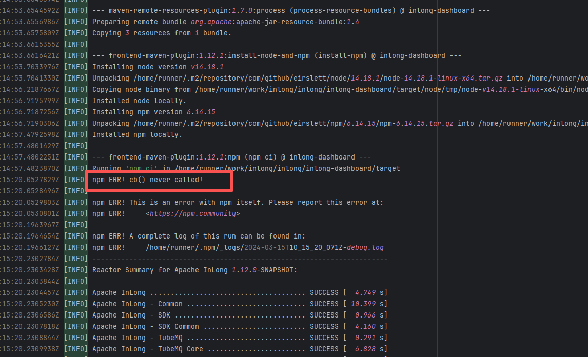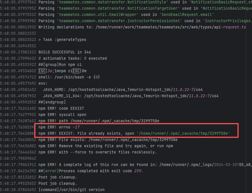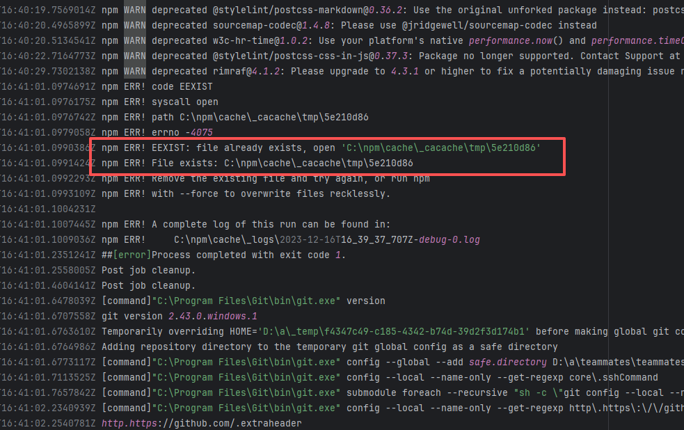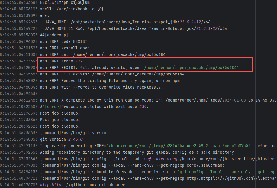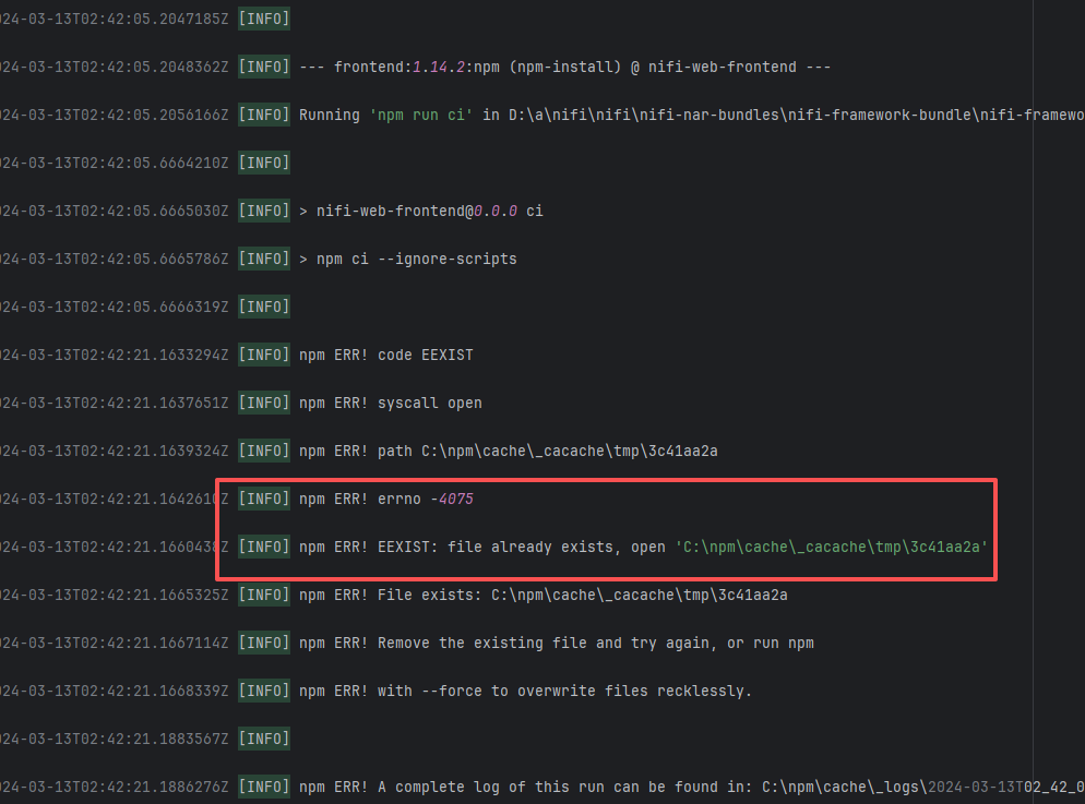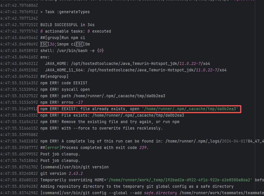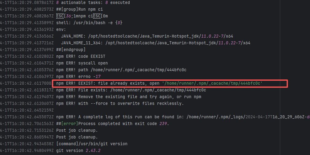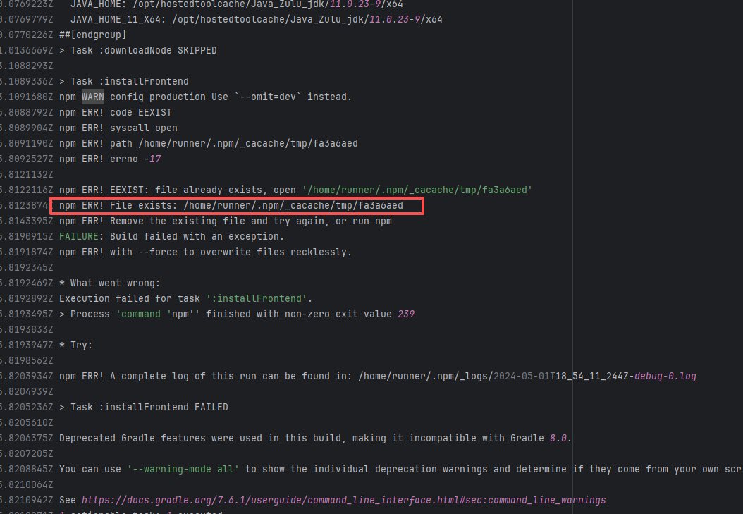 Error: This log shows that the installFrontend task failed during the execution of the Gradle build task. The specific error is related to npm installation, where an EEXIST error occurred, indicating that the cache file already exists, causing the execution to fail to continue. Root Cause: The EEXIST error means the file already exists. When npm tries to create the file /home/runner/.npm/_cacache/tmp/fa3a6aed, it finds that the file already exists. The error is due to previous builds or operations failing to clear the cache, leaving old files in the cache directory. Rerun succeeds after clearing the cache. |
