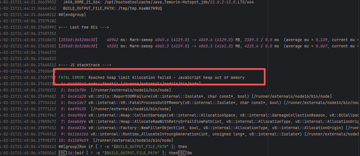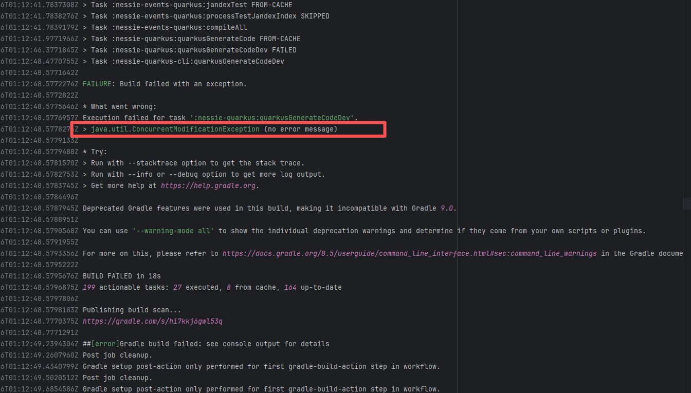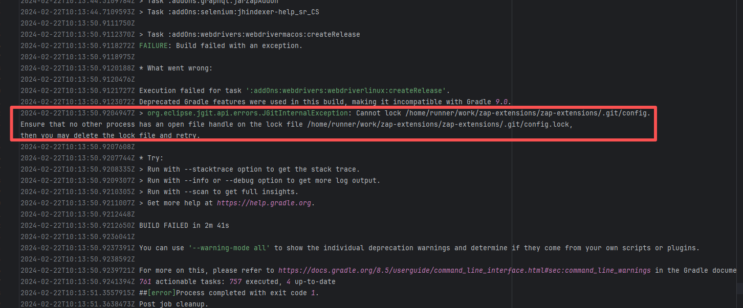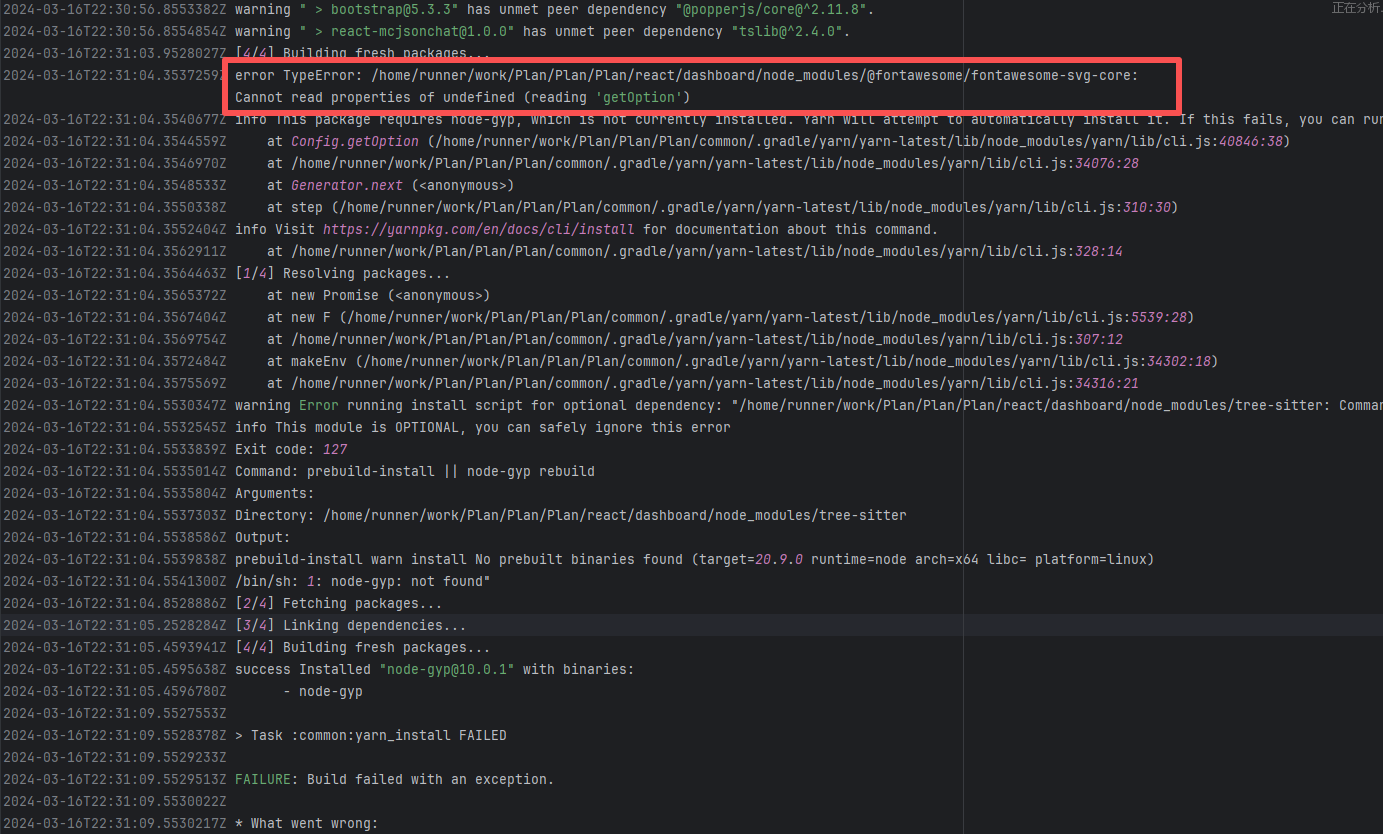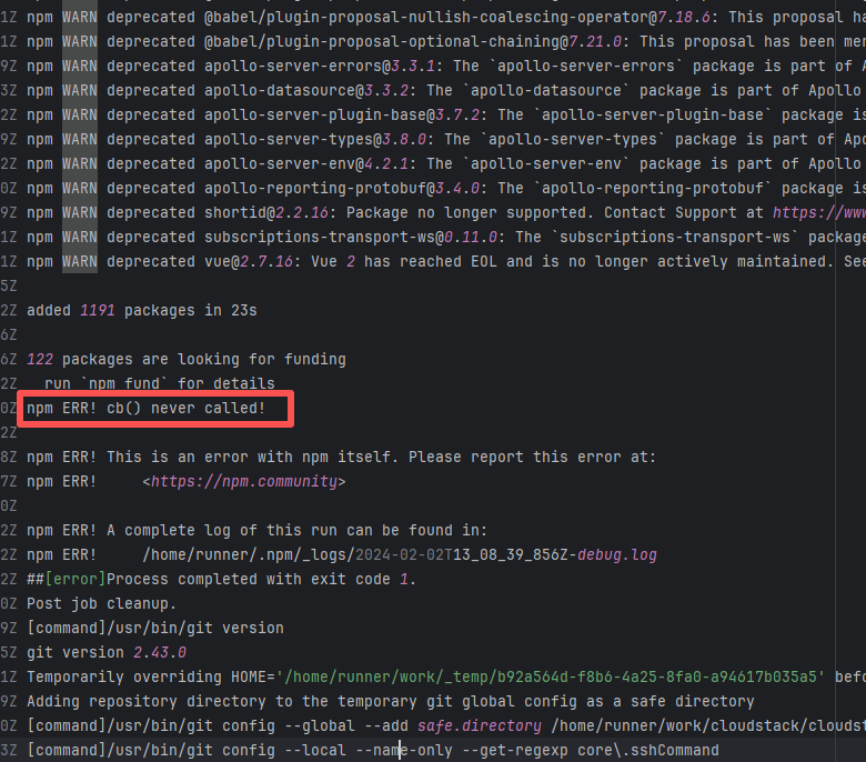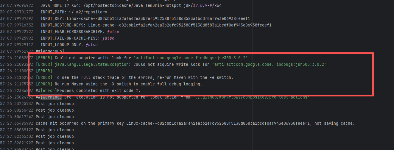 Error: This log shows that the installFrontend task failed during the execution of the Gradle build task. The specific error is related to npm installation, where an EEXIST error occurred, indicating that the cache file already exists, causing the execution to fail to continue. Root Cause: The EEXIST error means the file already exists. When npm tries to create the file /home/runner/.npm/_cacache/tmp/fa3a6aed, it finds that the file already exists. The error is due to previous builds or operations failing to clear the cache, leaving old files in the cache directory. Rerun succeeds after clearing the cache. |