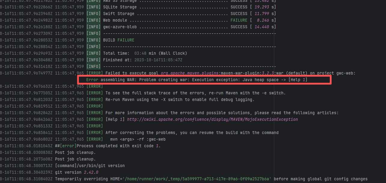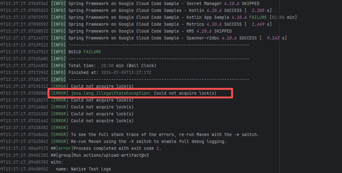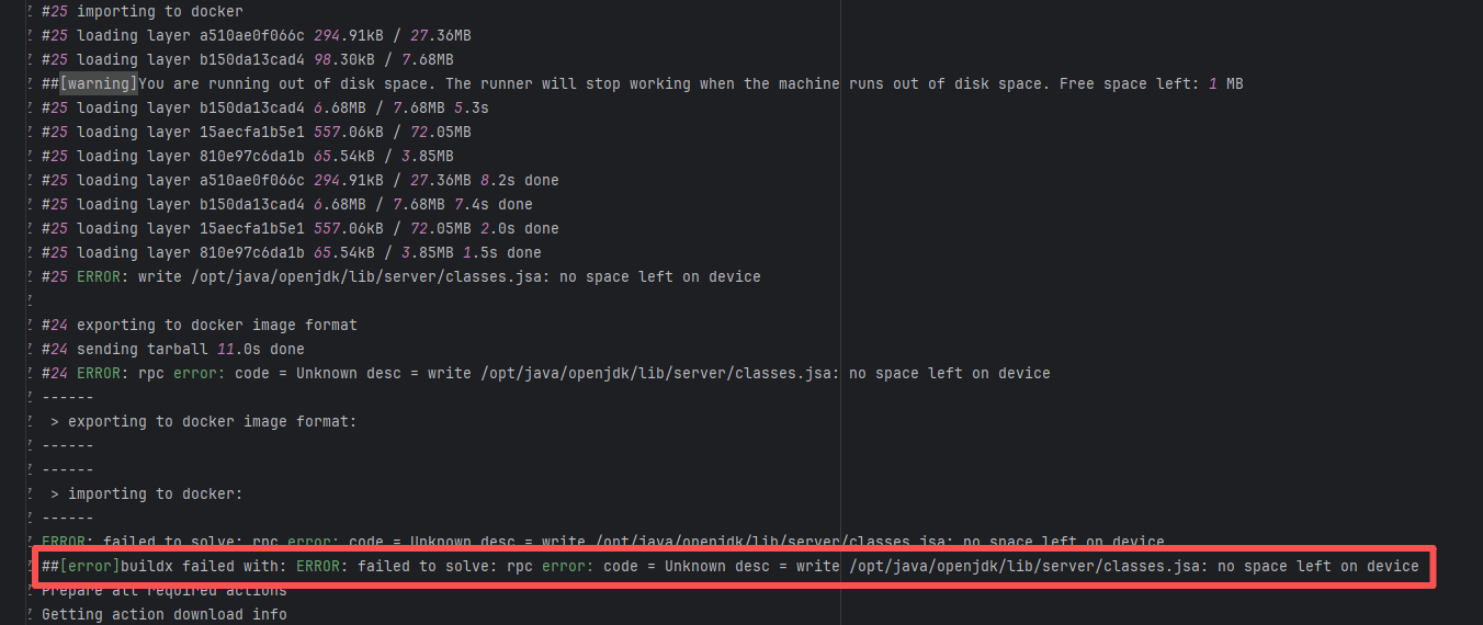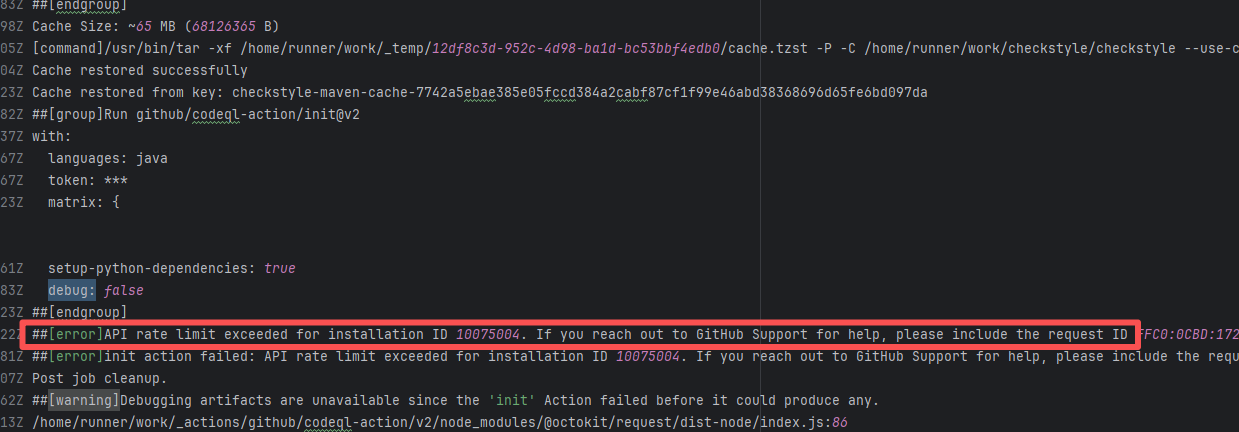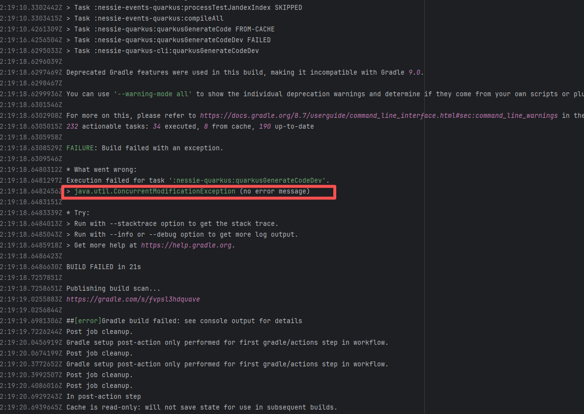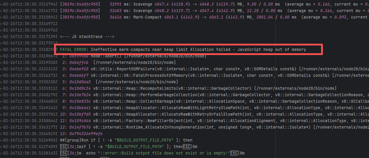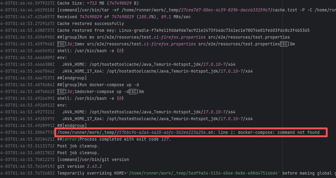 Error: This log shows that the installFrontend task failed during the execution of the Gradle build task. The specific error is related to npm installation, where an EEXIST error occurred, indicating that the cache file already exists, causing the execution to fail to continue. Root Cause: The EEXIST error means the file already exists. When npm tries to create the file /home/runner/.npm/_cacache/tmp/fa3a6aed, it finds that the file already exists. The error is due to previous builds or operations failing to clear the cache, leaving old files in the cache directory. Rerun succeeds after clearing the cache. |