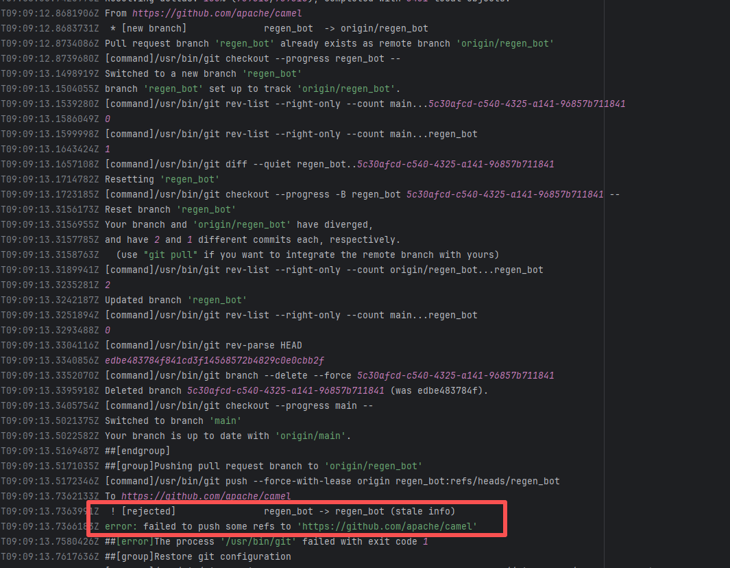 Error: During the git push phase in the log, when attempting to force push the local `regen_bot` branch to the remote, the remote branch `regen_bot` rejected the push, and the error message indicated "stale info". This means that there were changes on the remote branch, preventing the push from proceeding. Root Cause: Log analysis reveals that the first run failed because new code was pushed to the remote repository while the action was running, causing a conflict during the push. During the rerun, because `git pull` was executed, the script obtained the latest state of the base branch, and thus the rerun succeeded. |