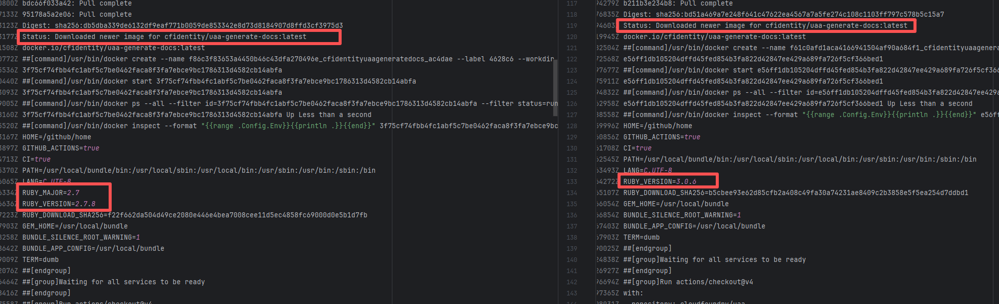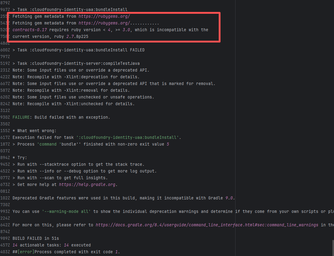 Error: The error log shows that during the execution of the bundleInstall task, the Ruby version being used (2.7.8) was incompatible with the required Ruby version. contracts-0.17 requires a Ruby version between 3.0 and 4.0, but the current version is 2.7.8, so the dependencies could not be installed normally. Root Cause: Comparing the successful and failed logs revealed that during the build process, the docker image installed, cfidentity/uaa-generate-docs, is always the latest version. After the failure, the developer modified the dependency version in the image, upgrading RUBY_VERSION from 2.7.8 to 3.0.6. The ruby version met the dependency requirements after rerun, thus the build succeeded. |