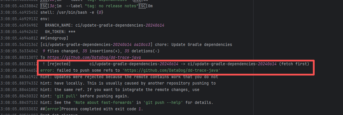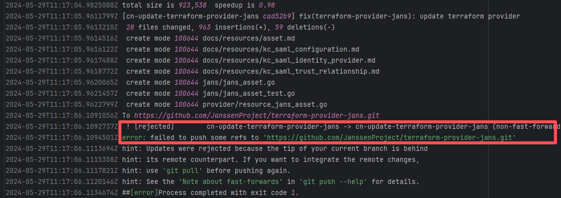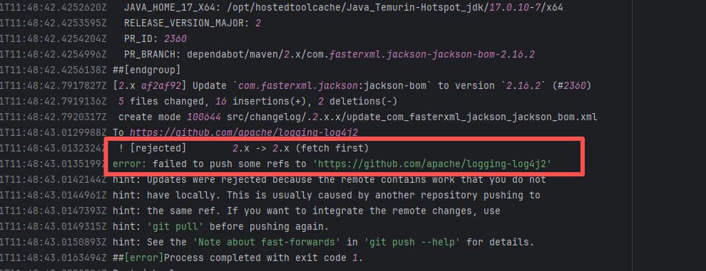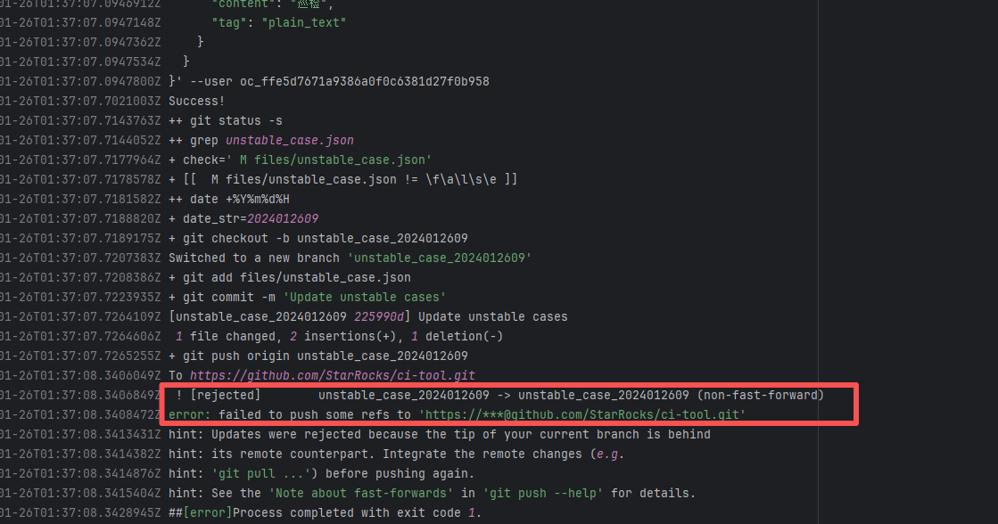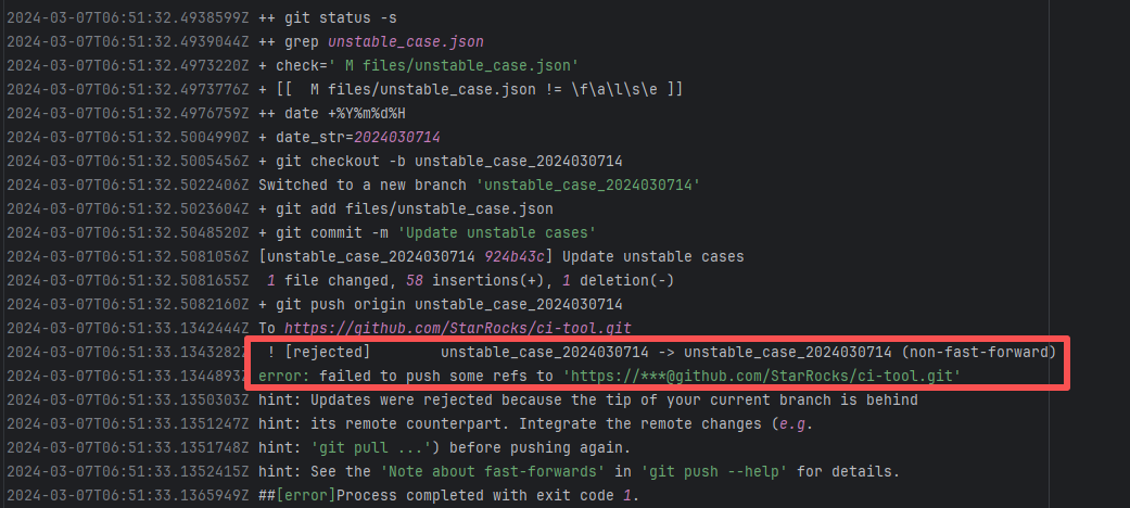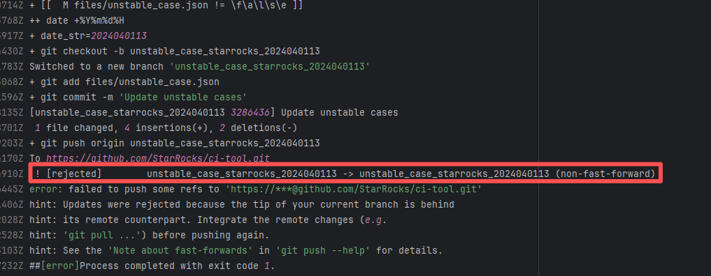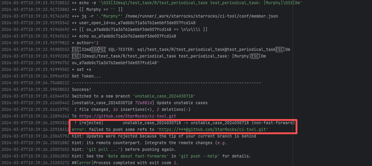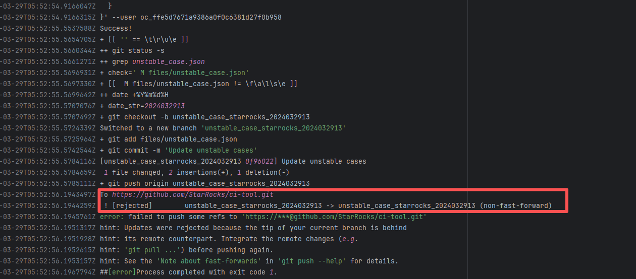 Error: The error message indicates a problem encountered when pushing a branch to the remote repository. The reason is that the specified branch on the remote repository has updates that the local repository does not. Specifically, the error message indicates that the specified remote branch contains changes not present locally, resulting in the push being rejected. Root Cause: Log analysis reveals that the first run failed because new code was pushed to the remote repository while the action was running, causing a conflict during the push. During the rerun, because `git pull` was executed, the script obtained the latest state of the base branch, and thus the rerun succeeded. |