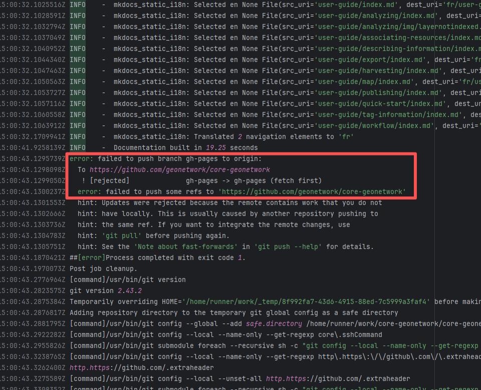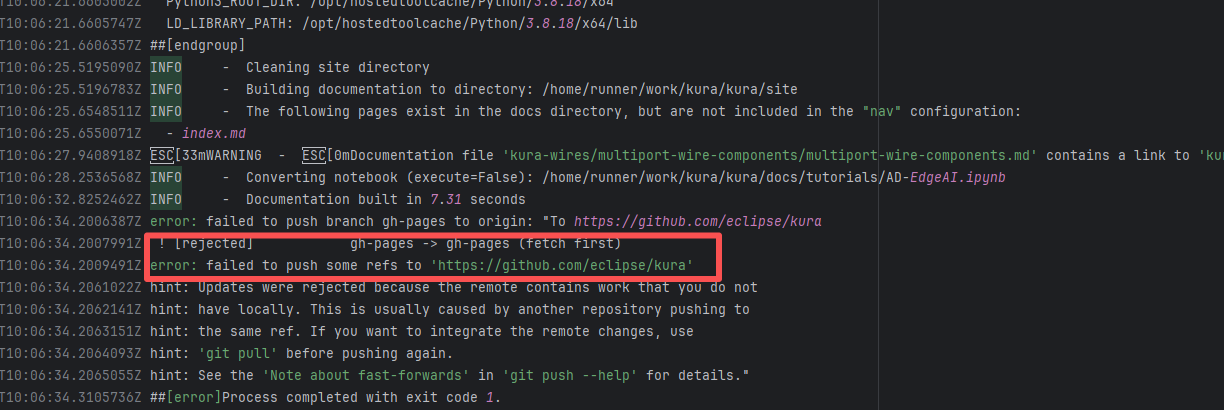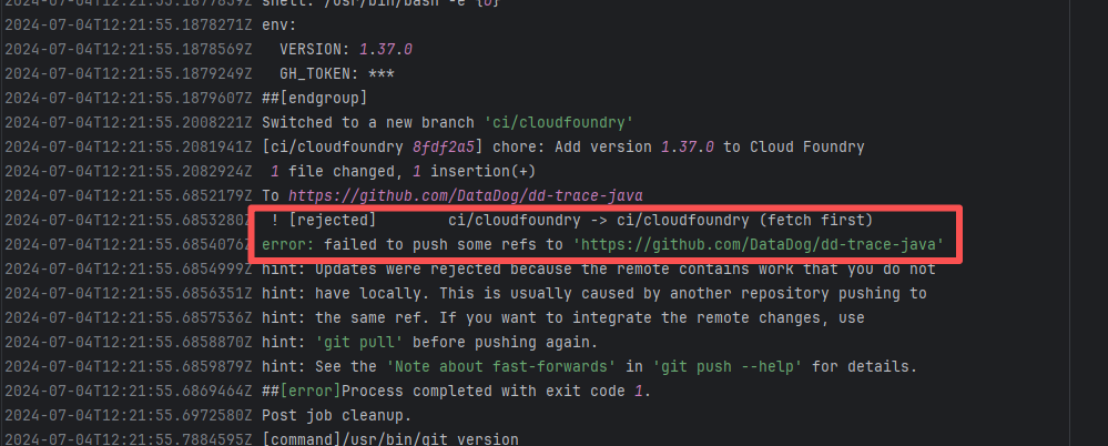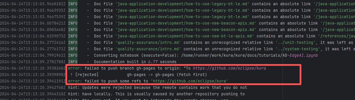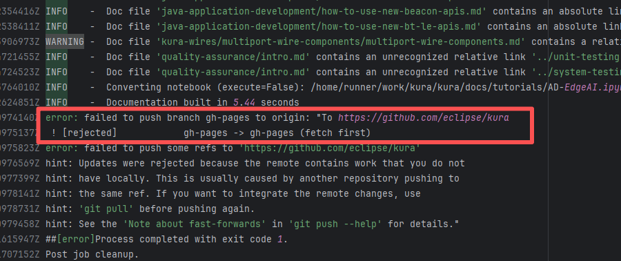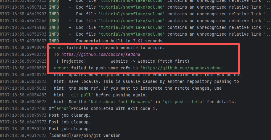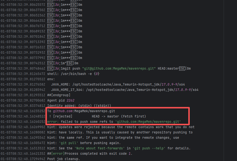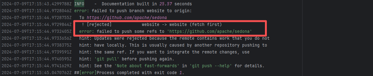 Error: The error message indicates a problem encountered when pushing a branch to the remote repository. The reason is that the specified branch on the remote repository has updates that the local repository does not. Specifically, the error message indicates that the specified remote branch contains changes not present locally, resulting in the push being rejected. Root Cause: Log analysis reveals that the first run failed because new code was pushed to the remote repository while the action was running, causing a conflict during the push. During the rerun, because `git pull` was executed, the script obtained the latest state of the base branch, and thus the rerun succeeded. |