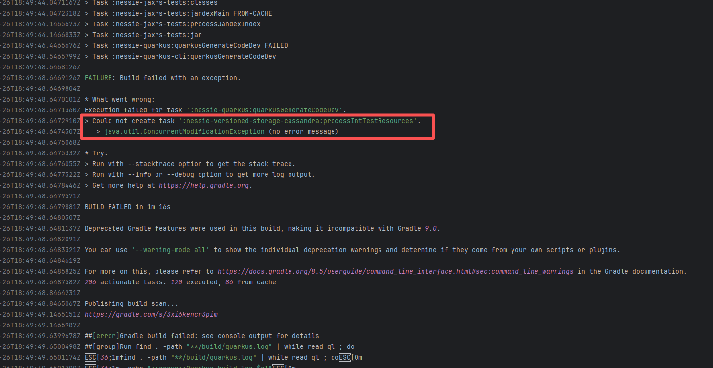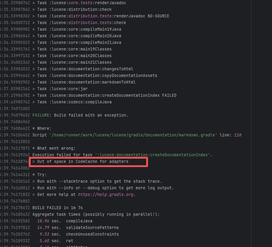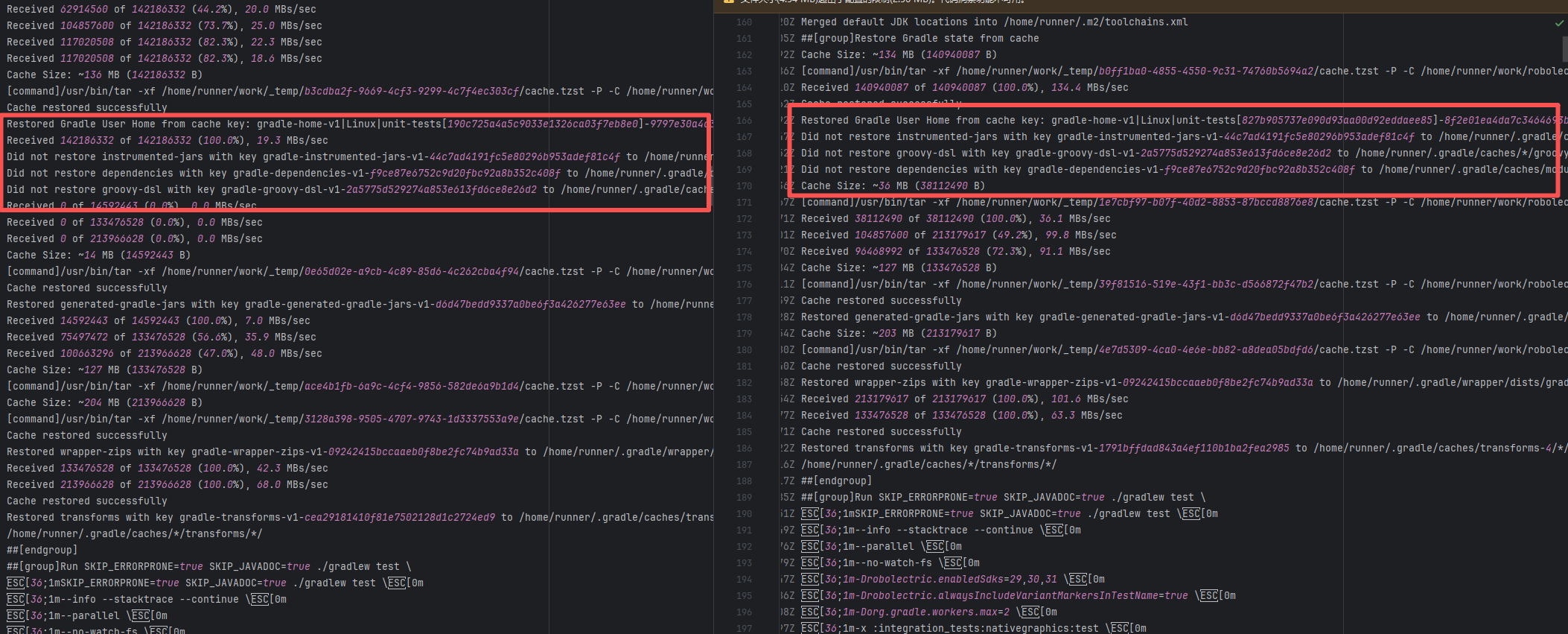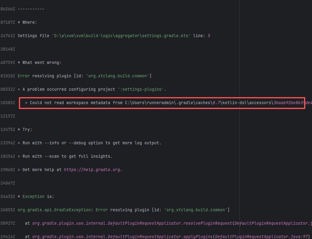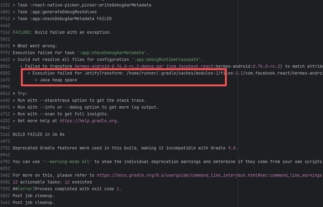 Error: The log shows that the error is the metadata file in the Gradle cache does not exist, which may be caused by a corrupted cache file. Root Cause: "Could not read workspace metadata" indicates that Gradle failed to read the file during the Gradle build process. This file is Gradle's metadata file in the cache. The error is due to some cache corruption making it unreadable. Rerun succeeds after clearing the Gradle cache. |