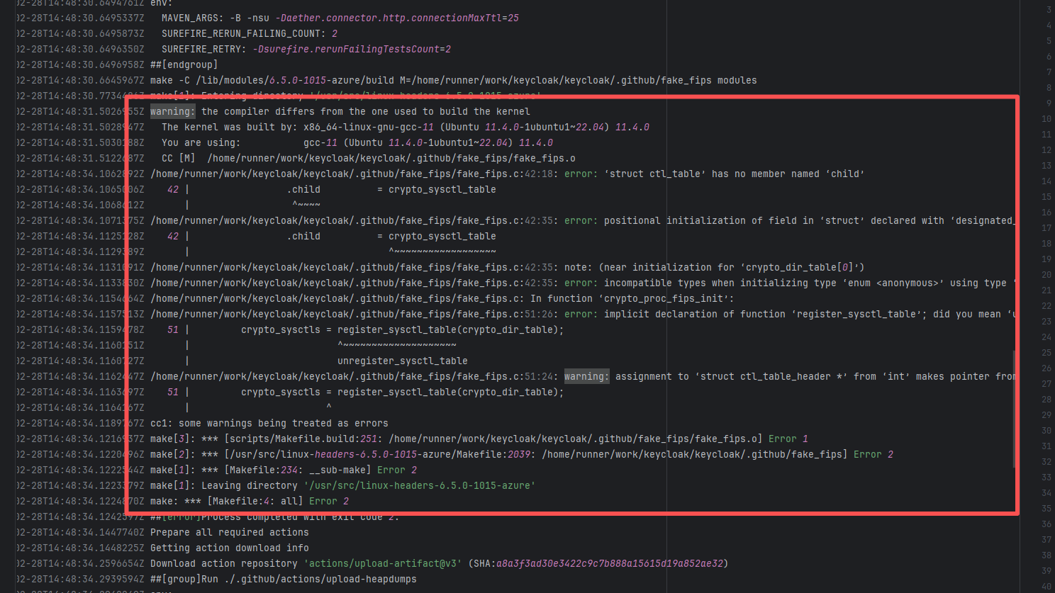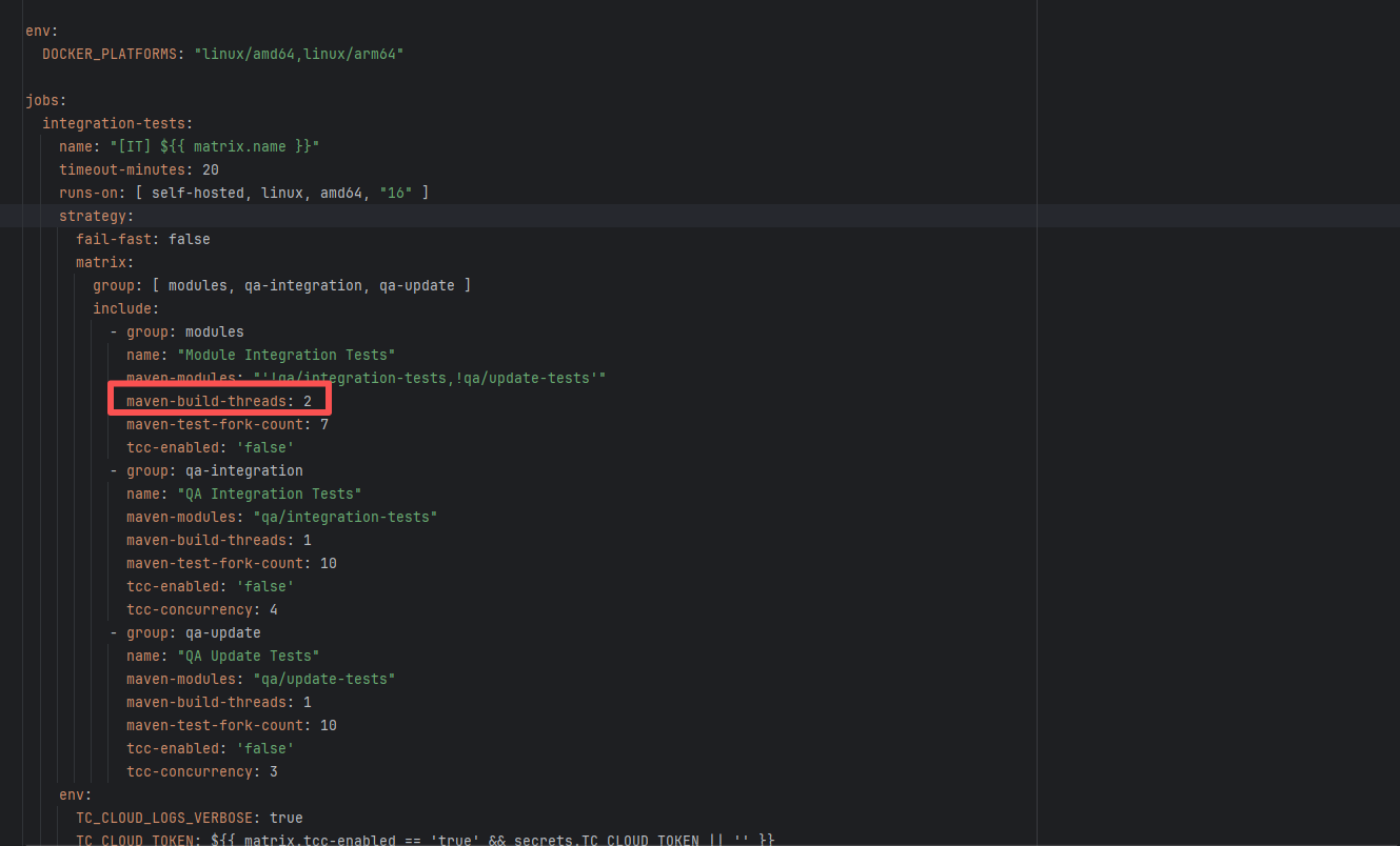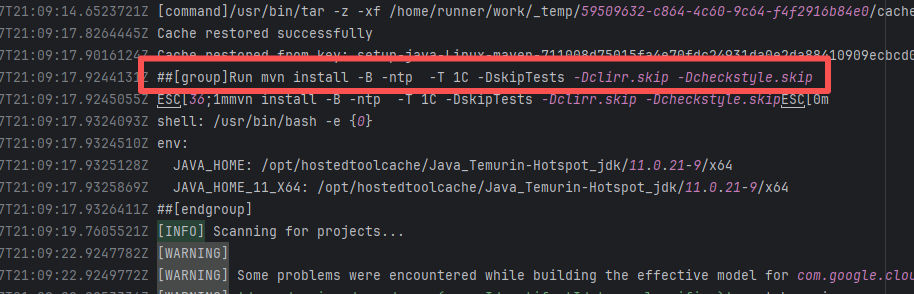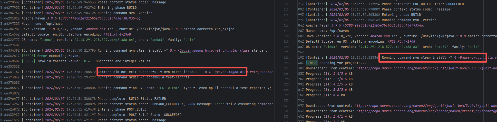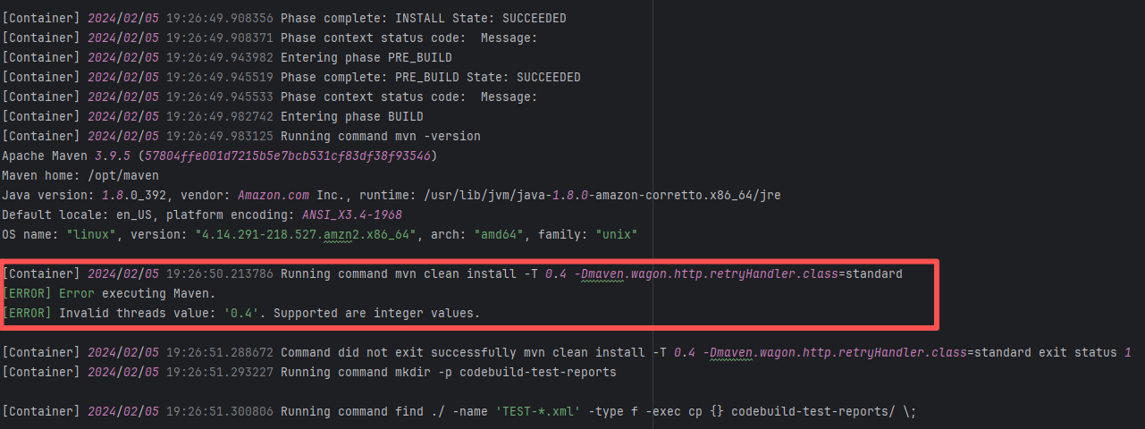 Error: The log error prompts "Invalid threads value: '0.4'". In the multi-threaded parallel build configuration, only -T <number> or -T <number>C is supported after -T. Root Cause: Careful analysis of the log reveals that the action used aws-actions/aws-codebuild-run-build@v1. AWS CodeBuild is Amazon's CI platform. The developer used an API to call AWS CI execution within GitHub CI. The specific CI script is configured in AWS. Therefore, the developer modified the relevant script on the external platform, and the rerun succeeded after modifying it to the correct thread count. |