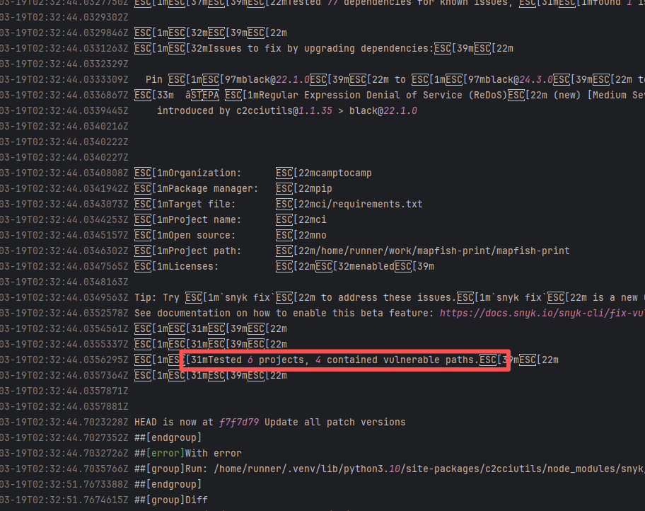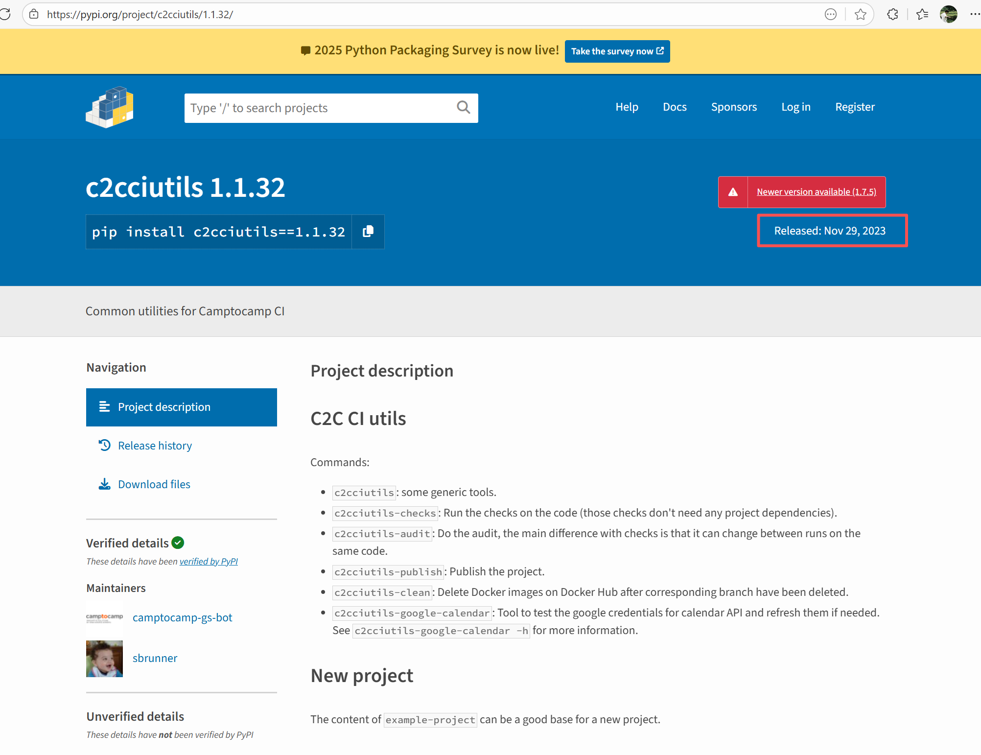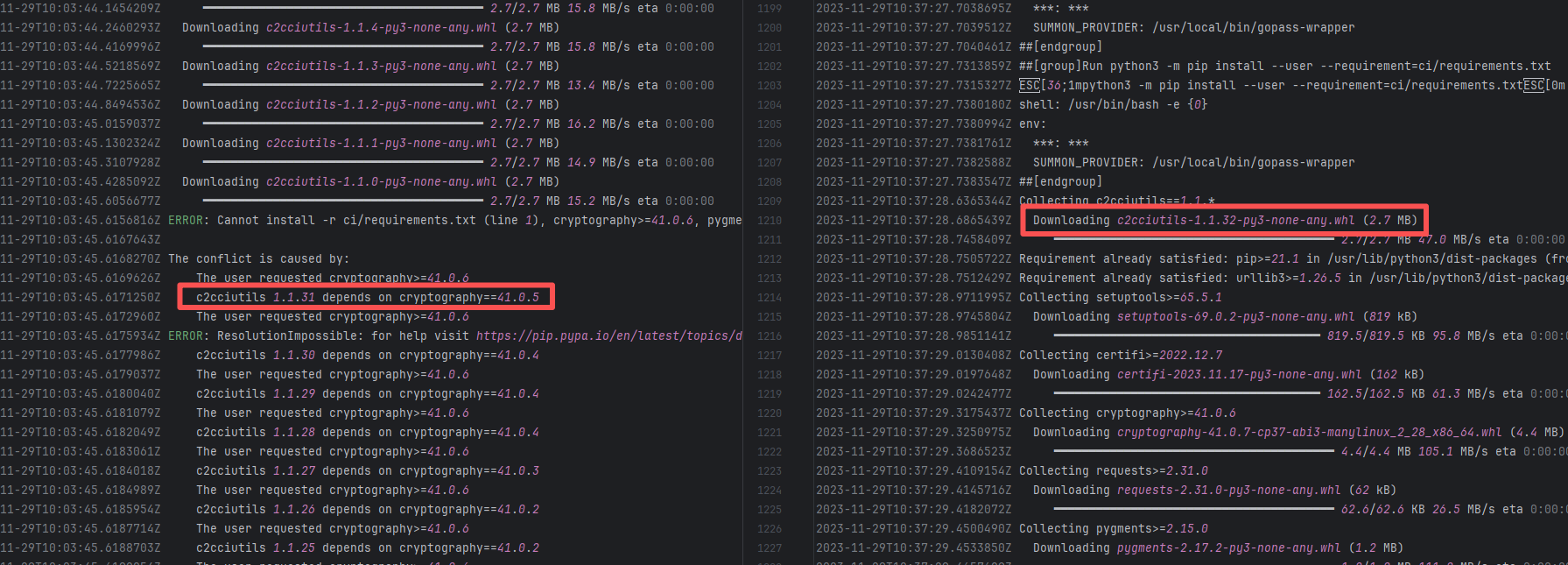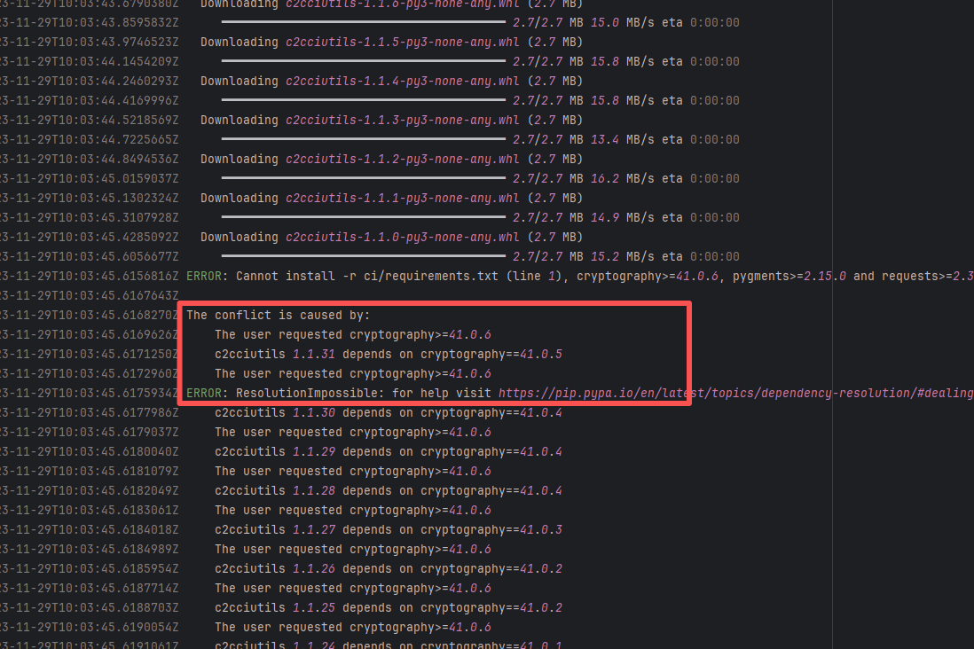 Error: The error log indicates conflicts between the version of the c2cciutils package and its dependencies, particularly concerning version incompatibilities with the cryptography package. The specific issue is: the installation of cryptography>=41.0.6 is requested in requirements.txt, but different versions of the c2cciutils package (such as 1.1.31, 1.1.30, 1.1.29, etc.) require the cryptography version to be 41.0.5 or lower, leading to version conflicts. Root Cause: Checking the upload log of https://pypi.org/project, when the failed build occurred, the latest available version of c2cciutils was 1.1.31. However, after the failure, version 1.1.32 was uploaded. Version 1.1.32 is based on cryptography version 41.0.6, which satisfies the requirements in the requirement file. Therefore, the rerun succeeded. |