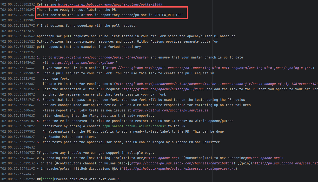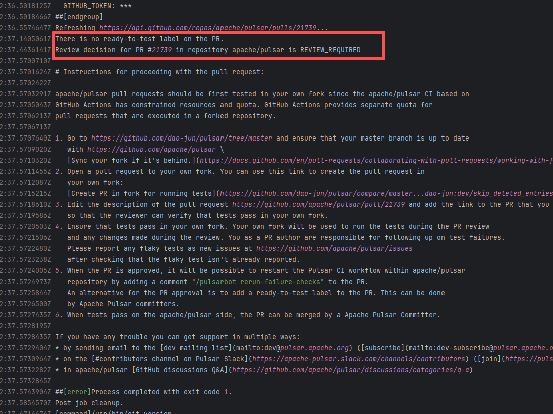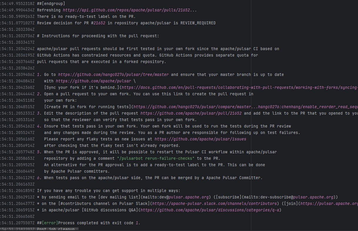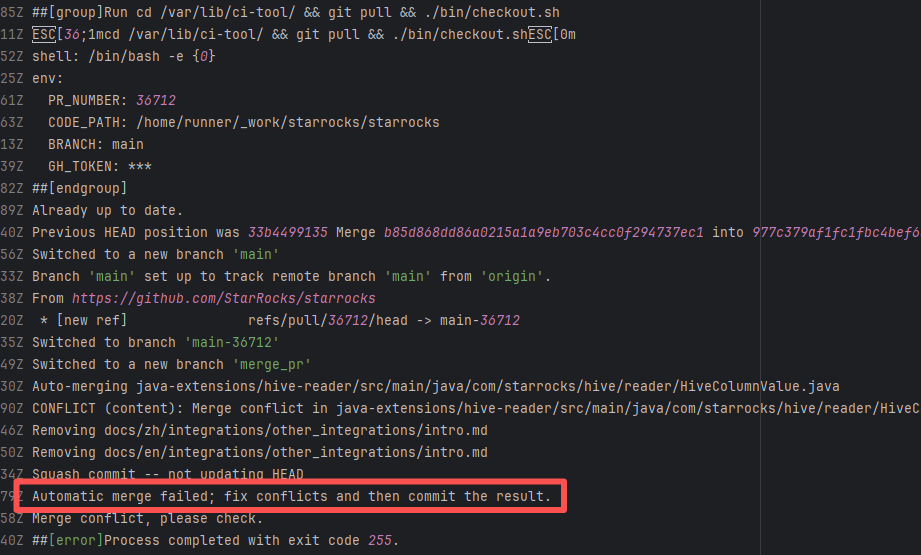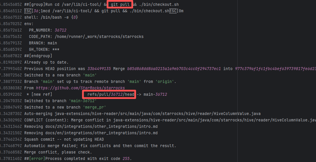 Error: The error log indicates that the script failed during the automatic code merge task because there were unresolvable conflicts between files, preventing Git from merging automatically. Root Cause: Log analysis reveals that the script executed the command `git pull refs/pull/36712/head`. This command pulls the latest commit from the PR, rather than the commit that triggered the action. This causes the rerun's code to be different every time there is a new commit in the PR. After the developer resolved the conflicting code, the rerun succeeded. |