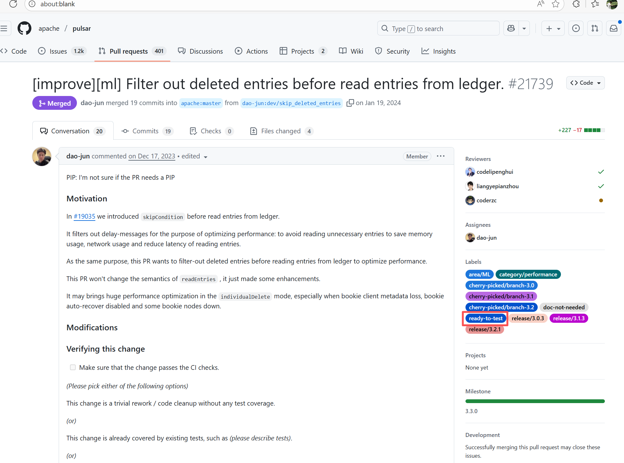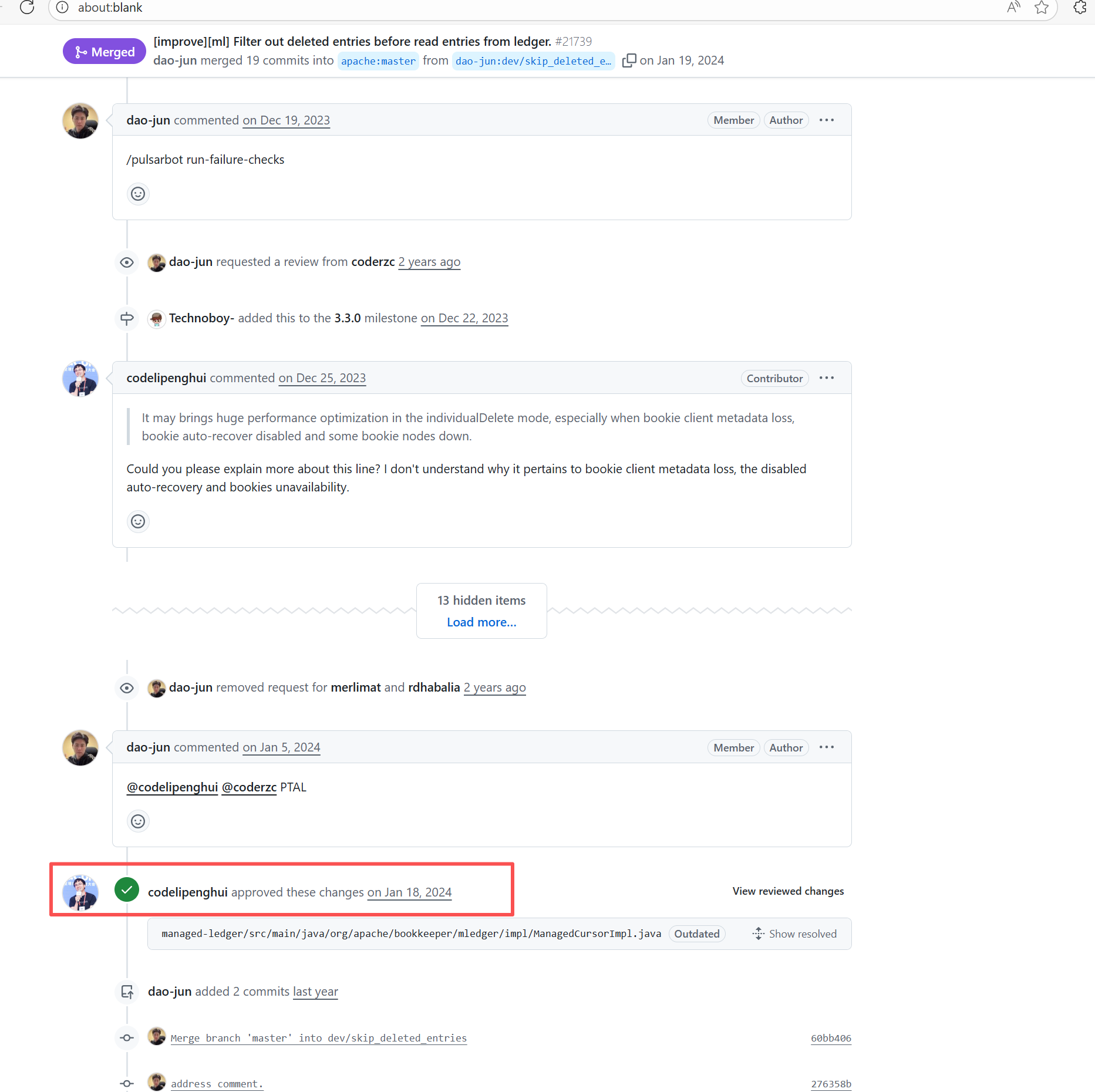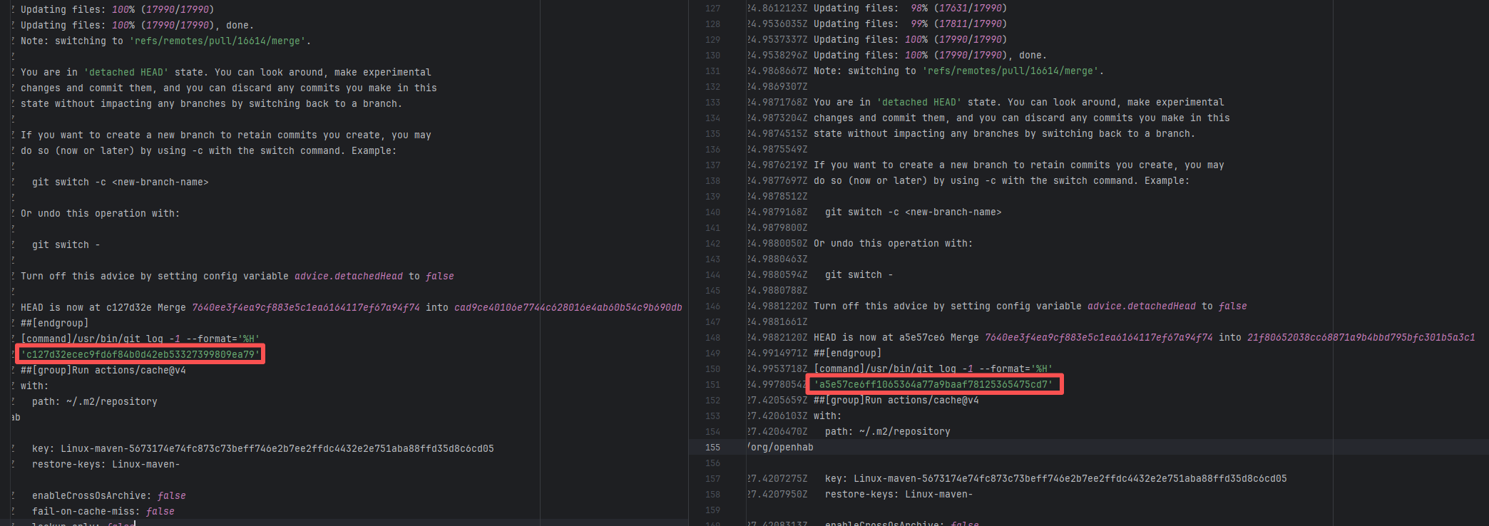 Error: The error log indicates that the script failed during the automatic code merge task because there were unresolvable conflicts between files, preventing Git from merging automatically. Root Cause: Log analysis reveals that the script executed the command `git pull refs/pull/36712/head`. This command pulls the latest commit from the PR, rather than the commit that triggered the action. This causes the rerun's code to be different every time there is a new commit in the PR. After the developer resolved the conflicting code, the rerun succeeded. |
