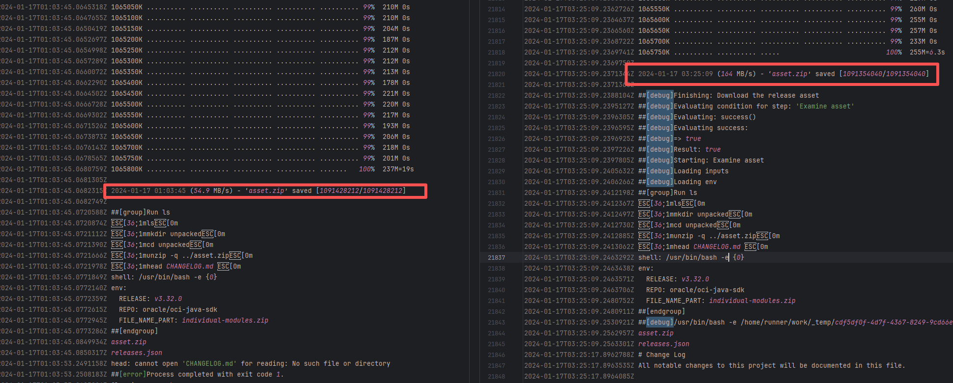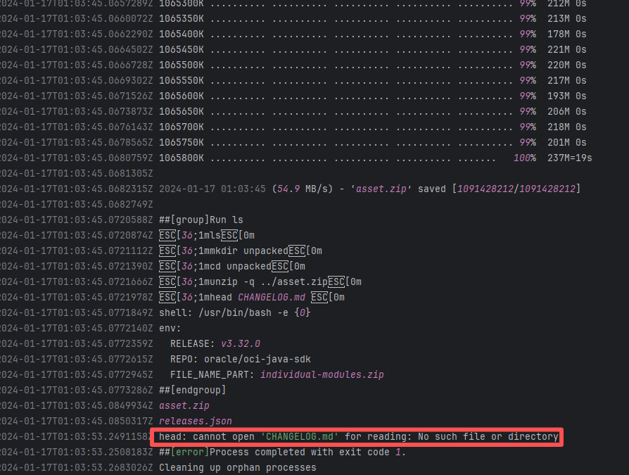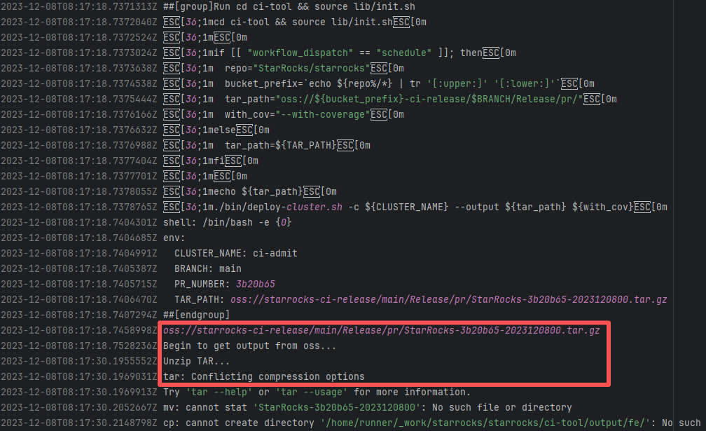 Error: The log error shows that tar failed to decompress the downloaded tar.gz resource, resulting in a missing subsequent path. "Conflicting compression options" indicates that the tar command parameters do not match the file format. Root Cause: Comparing the logs revealed that it executed successfully after a rerun. Therefore, the error is not an issue with the tar command parameters in the script, but rather because the downloaded file was corrupted, causing tar to be unable to recognize it. |