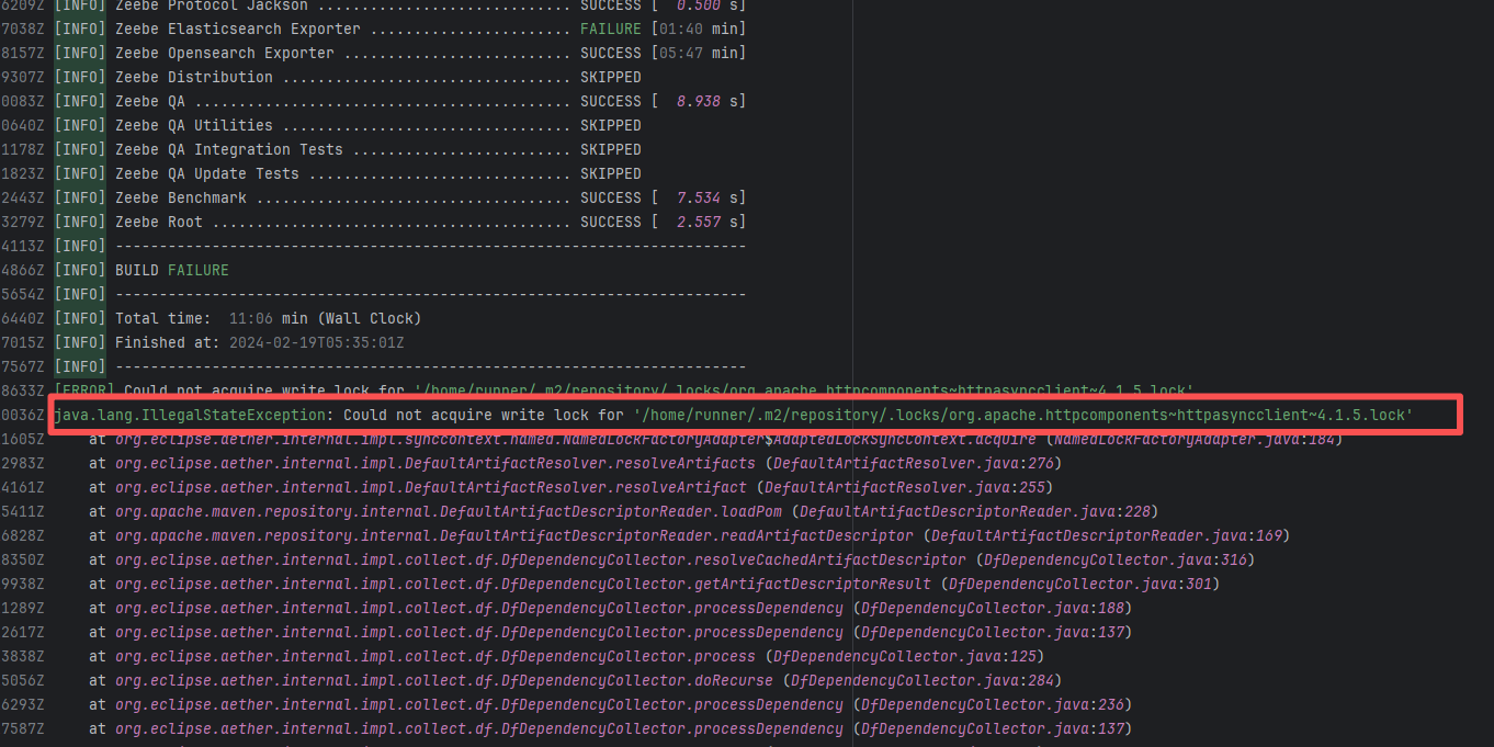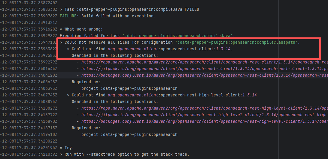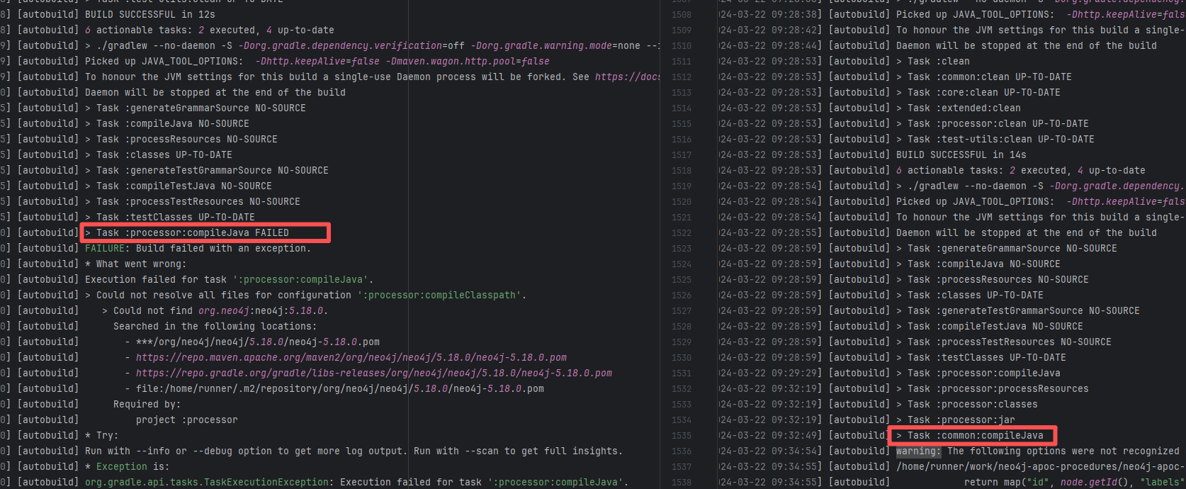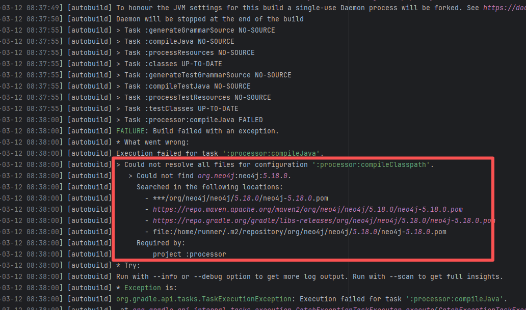 Error: The error message indicates that the build failed because the dependency org.neo4j:neo4j:5.18.0 could not be resolved. The build system tried multiple repository addresses but did not find the dependency file for this version. Root Cause: Checking the repository dependencies revealed that it had not been uploaded before the job execution (3-12). The dependency was uploaded on 3-13, and the dependency downloaded successfully after a rerun on 3-22. |