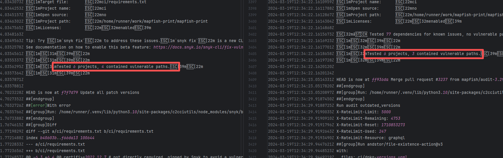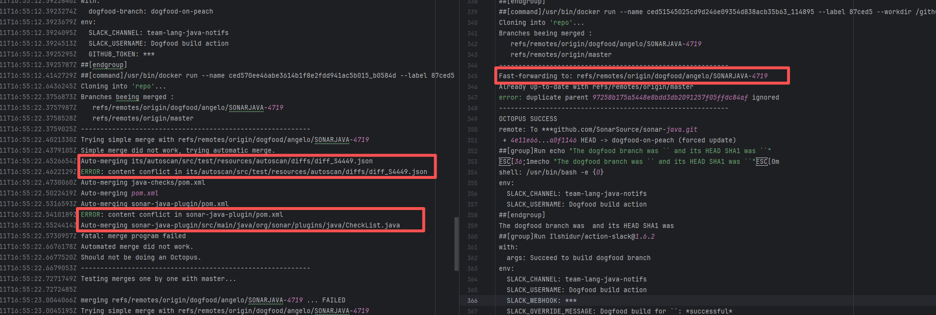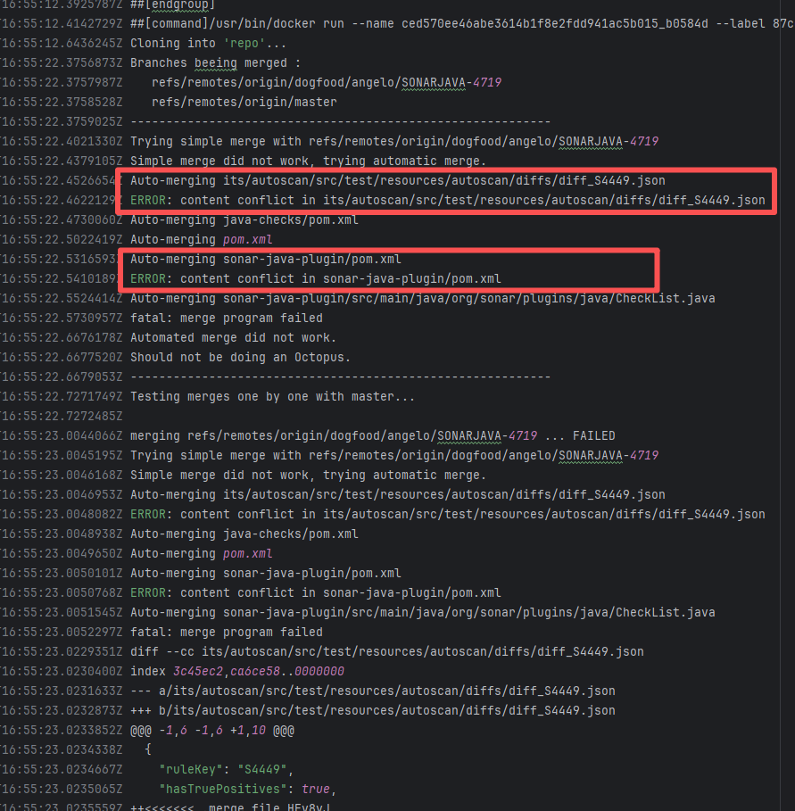 Error: The error message indicates that the failure occurred when multiple branches attempted to merge simultaneously. The cause of the failure was file content conflicts that could not be automatically resolved. Root Cause: Log analysis reveals that the warning `duplicate parent ignored` appeared in the successful logs, indicating that duplicate parent commits were found during the merge process. This means the developer applied the same commit to multiple branches. Therefore, when rerunning and applying the multi-branch merge again, it succeeded, avoiding complex multi-branch conflicts. |