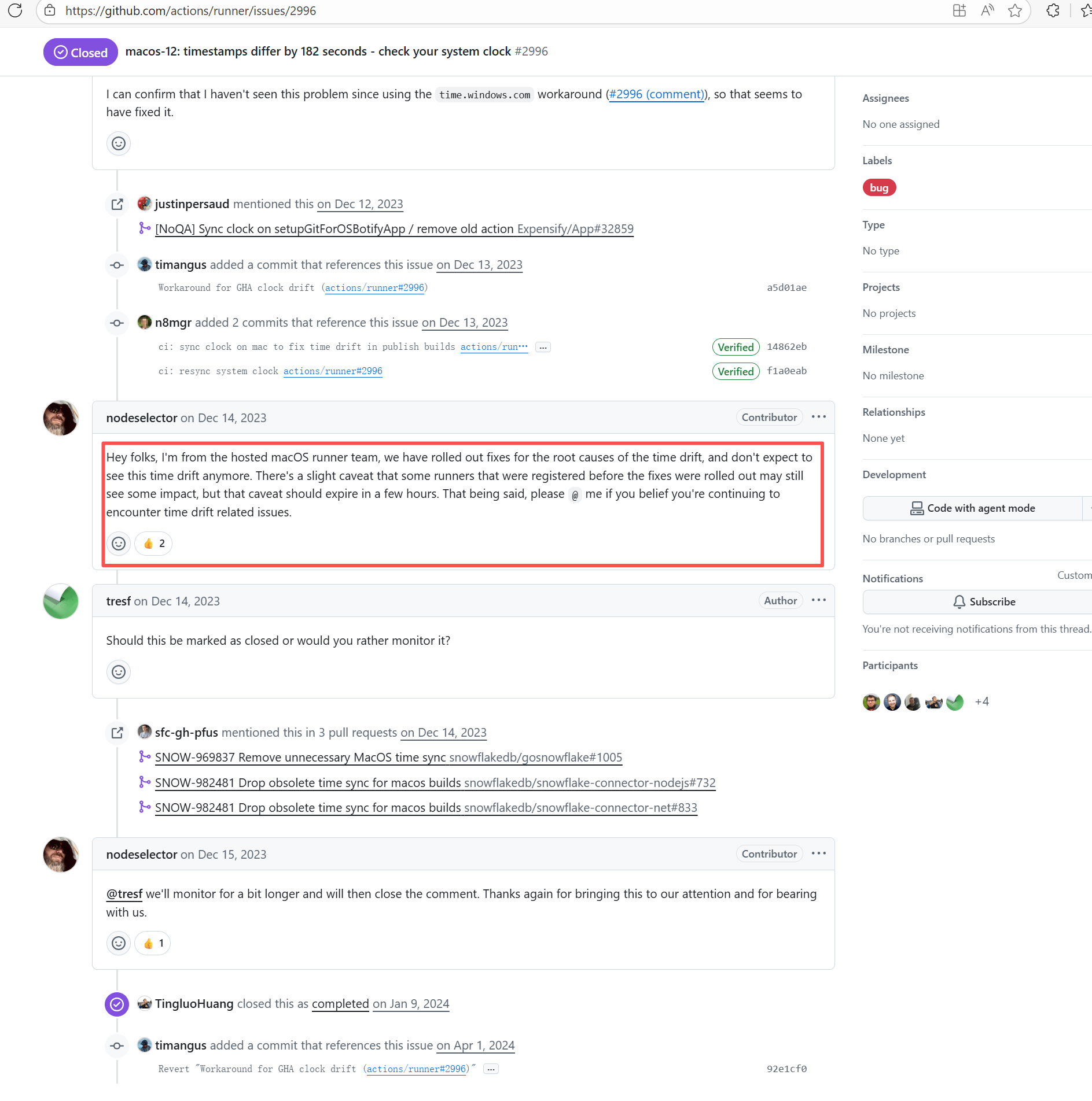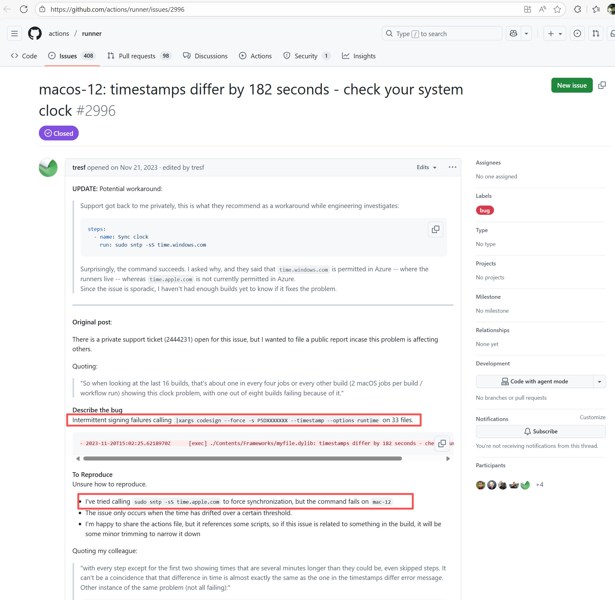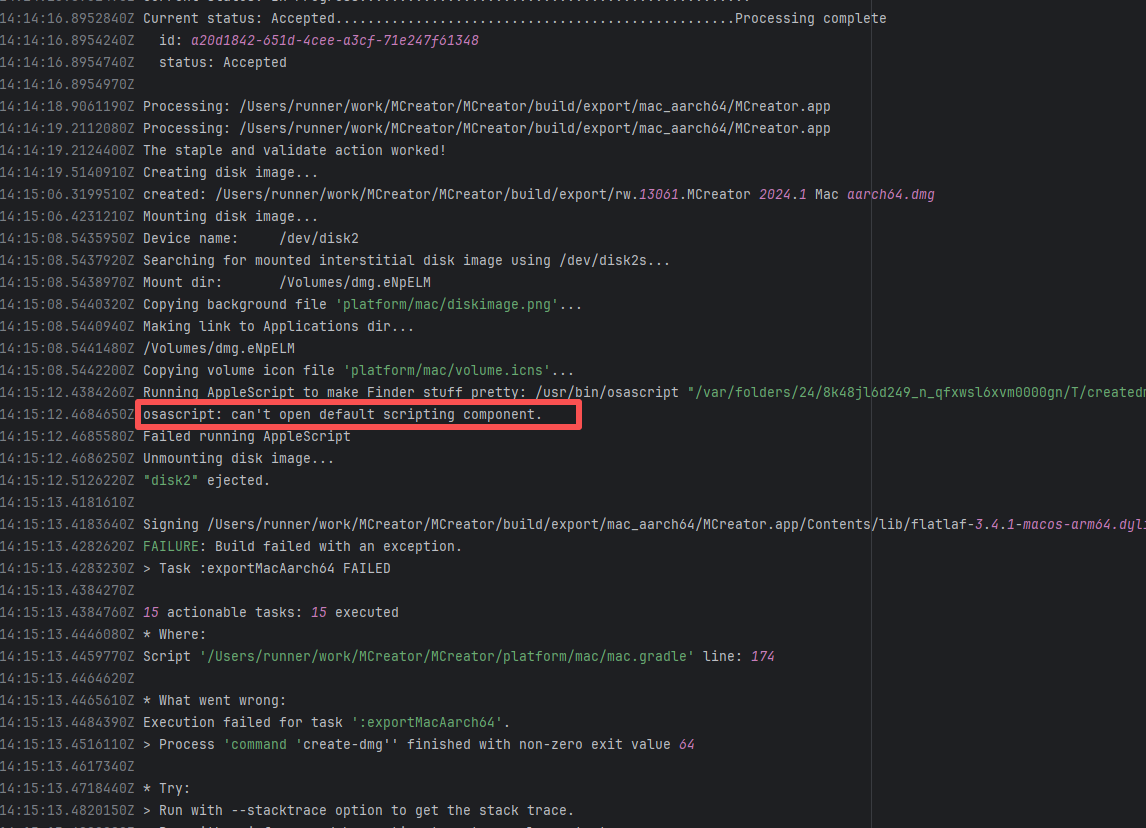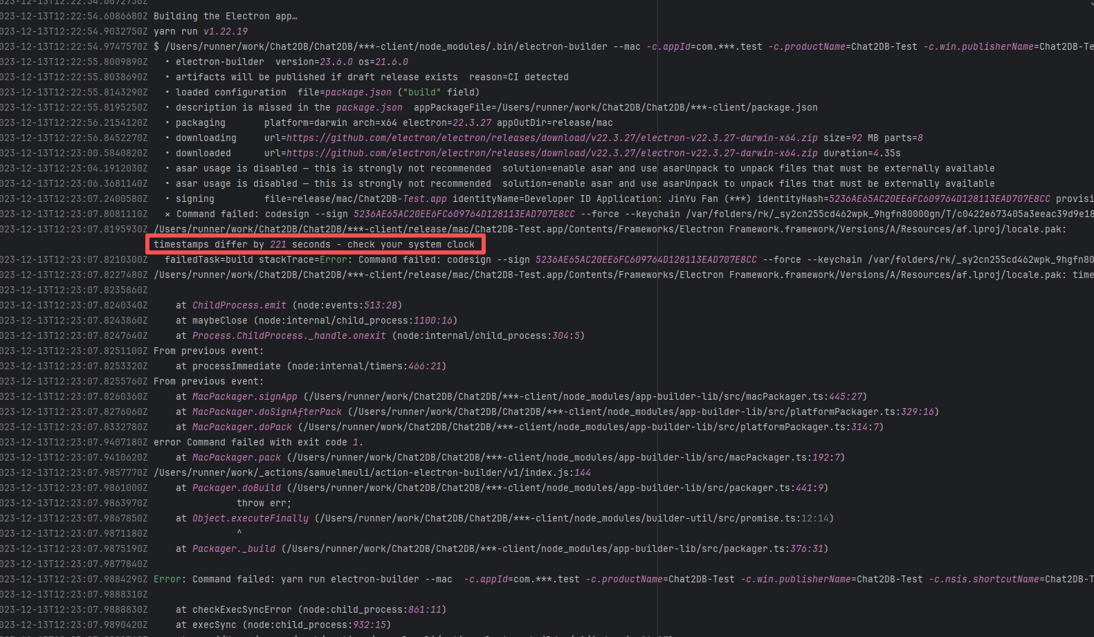 Error: The error log shows `timestamps differ by 182 seconds`, which means that when executing the macOS application signing command `codesign`, the system detected inconsistent file timestamps (i.e., the file's "modification time" differed too much from the system time). Root Cause: According to related Issues (https://github.com/actions/runner/issues/2996), the root cause is a macOS runner system error. When signing a .app package, the macOS codesign tool verifies the file modification time (mtime), current system time, certificate issuance time, and validity period. If a file timestamp is found to be in the "future" or "expired", the signature is rejected. This issue occurs sporadically during builds and can be temporarily bypassed by using `sudo sntp -sS time.windows.com` to actively sync the clock. A permanent fix will be provided by the macOS team. |