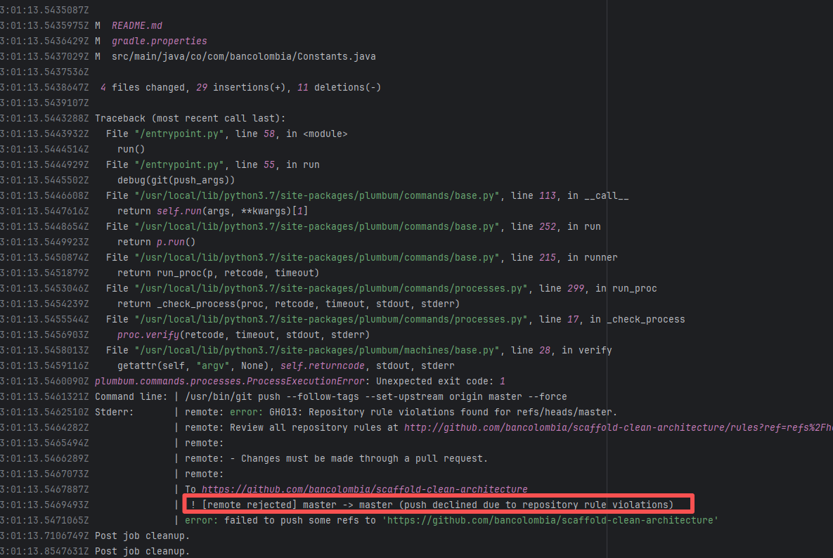 Error: The error message indicates that "Repository Rules" are enabled on the GitHub repository, prohibiting direct pushes to the `master` branch and requiring merges via Pull Requests (PRs). Root Cause: The rerun succeeded without any script modifications, indicating that the developer temporarily disabled the PR rule restrictions. |