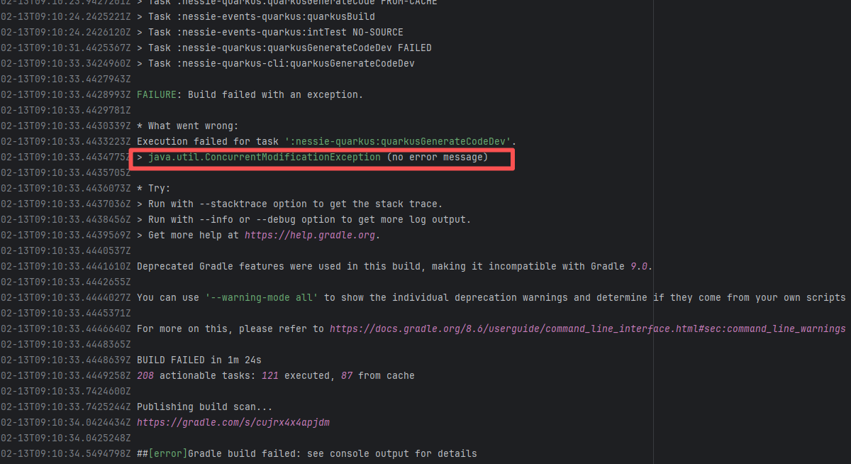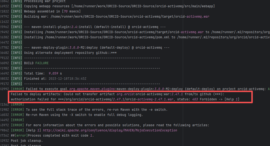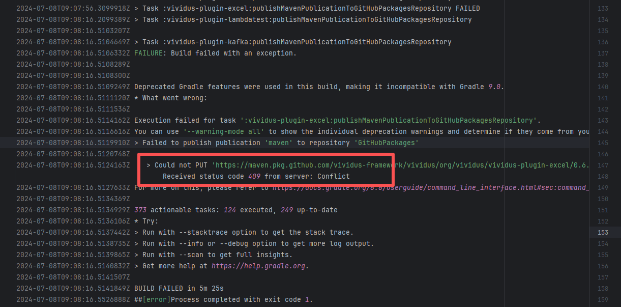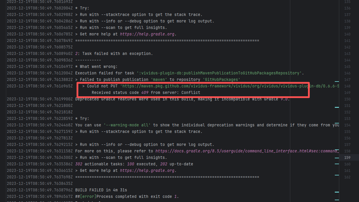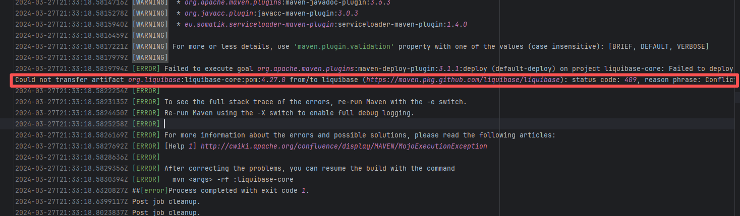 Error: The error log indicates a failure when publishing a Maven artifact to the GitHub Packages repository. The core reason is receiving a 409 Conflict response, indicating that the artifact to be uploaded conflicts with an artifact that already exists in the repository. Root Cause: The script specifies that the snapshot version of the build product should be named with a timestamp, so conflicts should not occur during the upload process. However, because caching was enabled during the Gradle build process and the clean command was not executed, the old snapshot artifact and compilation results in the build/ directory were used and directly reused for upload, leading to a GitHub Packages 409 conflict. Rerun succeeded after clearing the previous local cache results. |