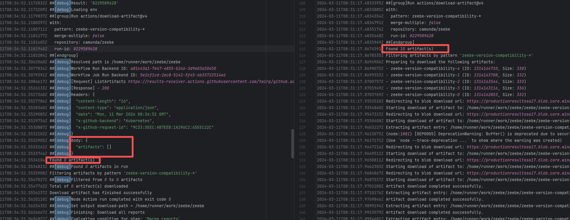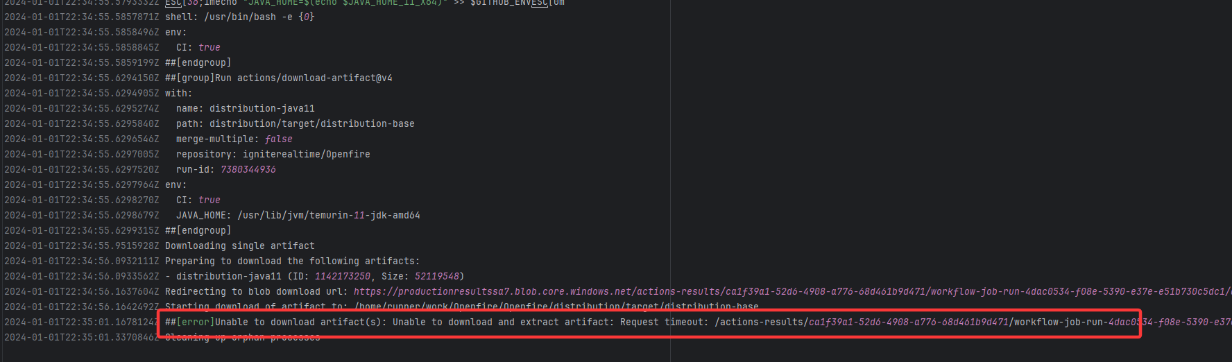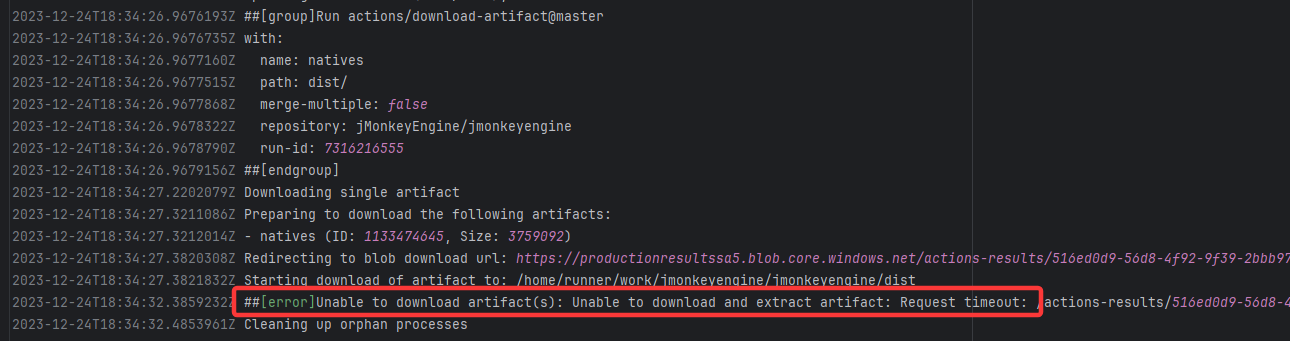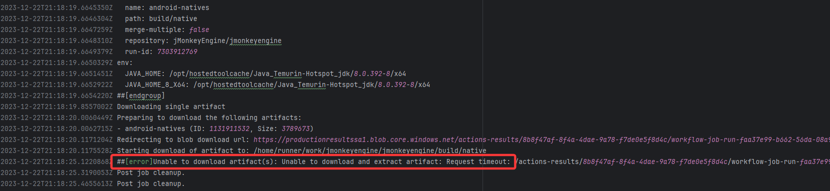 Error: The error indicates that the workflow failed due to a timeout while downloading the Artifact. Root Cause: The download operation was successfully executed after a rerun. |