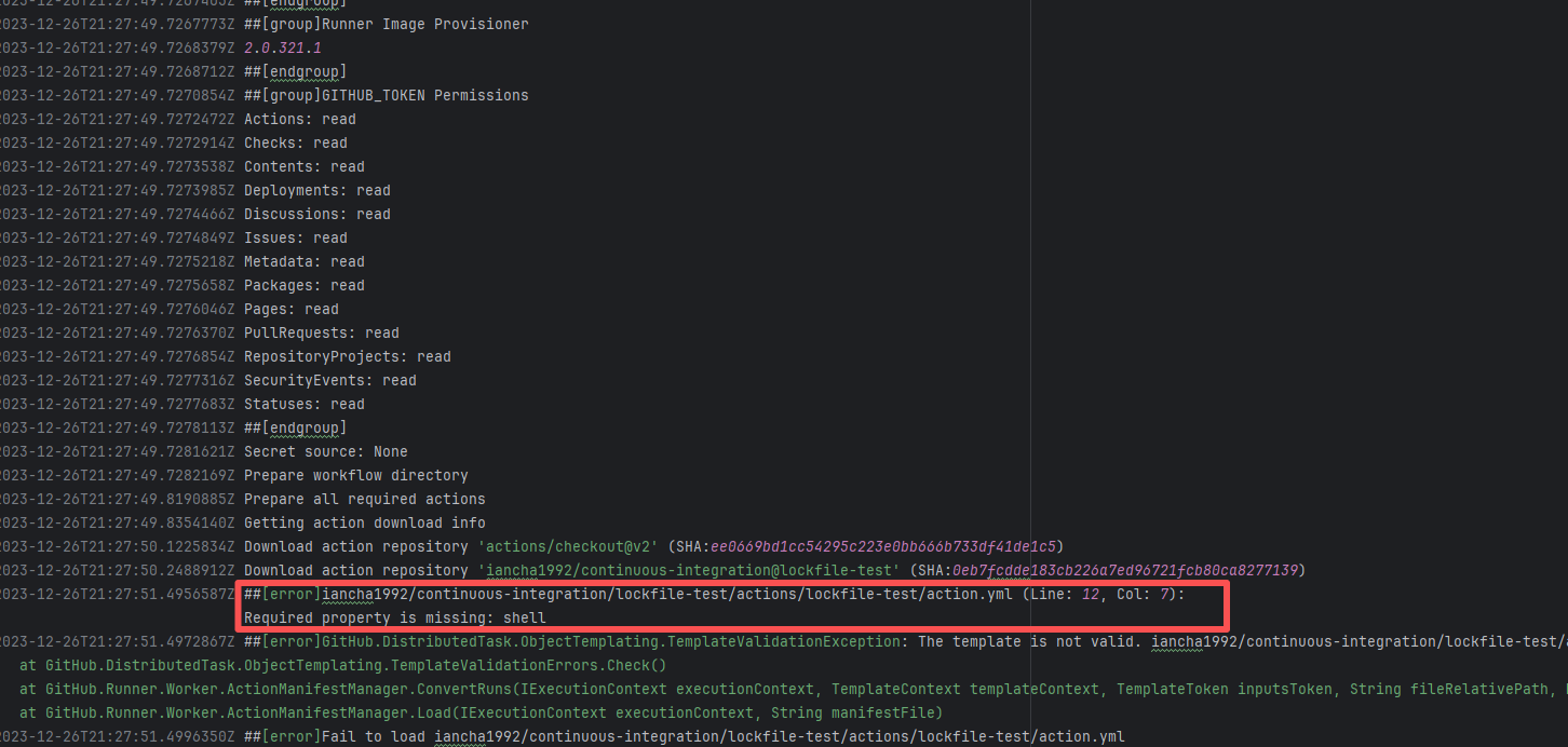 Error: The error prompt indicates that the shell attribute is missing on line 12 of the action.yml file. 'shell' is a required field in GitHub Actions to specify the script execution environment (such as bash, sh, powershell, etc.). If a 'run' field is defined in action.yml, the shell attribute must be specified to tell GitHub Actions which shell to use to execute the command. Root Cause: Succeeded after modifying the action script and rerunning. |