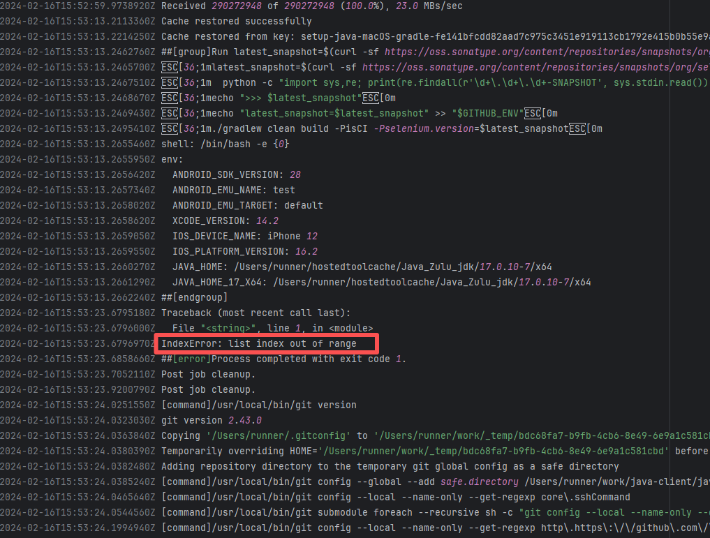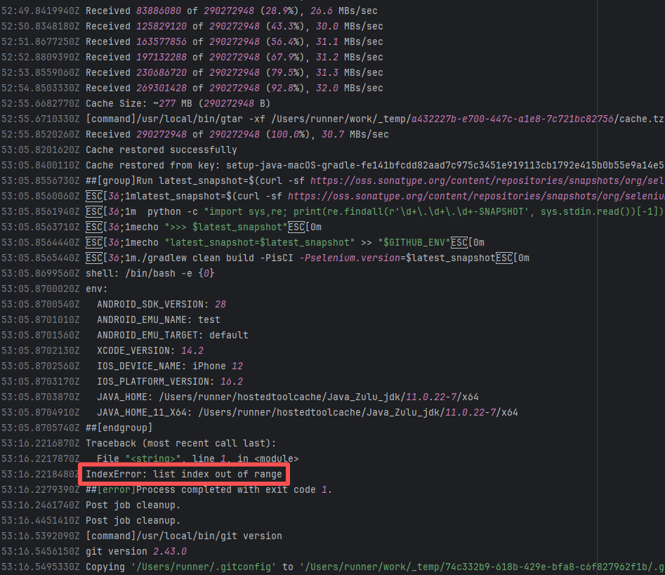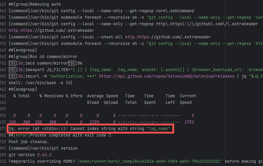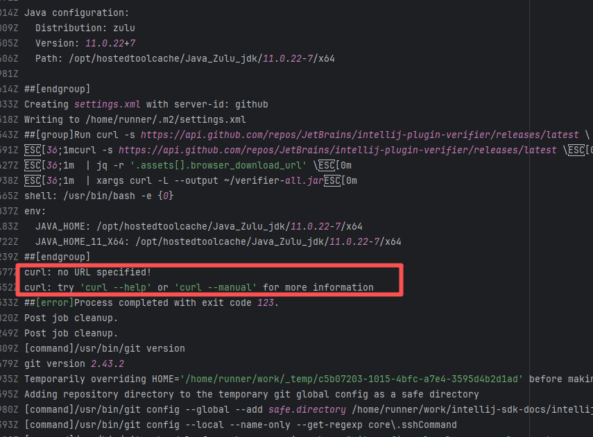 Error: The error "curl: no URL specified!" indicates that the curl command did not specify a valid URL parameter, causing the command execution to fail. Root Cause: Log analysis reveals that curl was used to request the GitHub API for the latest version of intellij-plugin-verifier, and jq was used to extract the download URL from the returned data. Therefore, this error is not a script configuration issue, but a failure to obtain the relevant URL resource. Succeeded after rerun. |