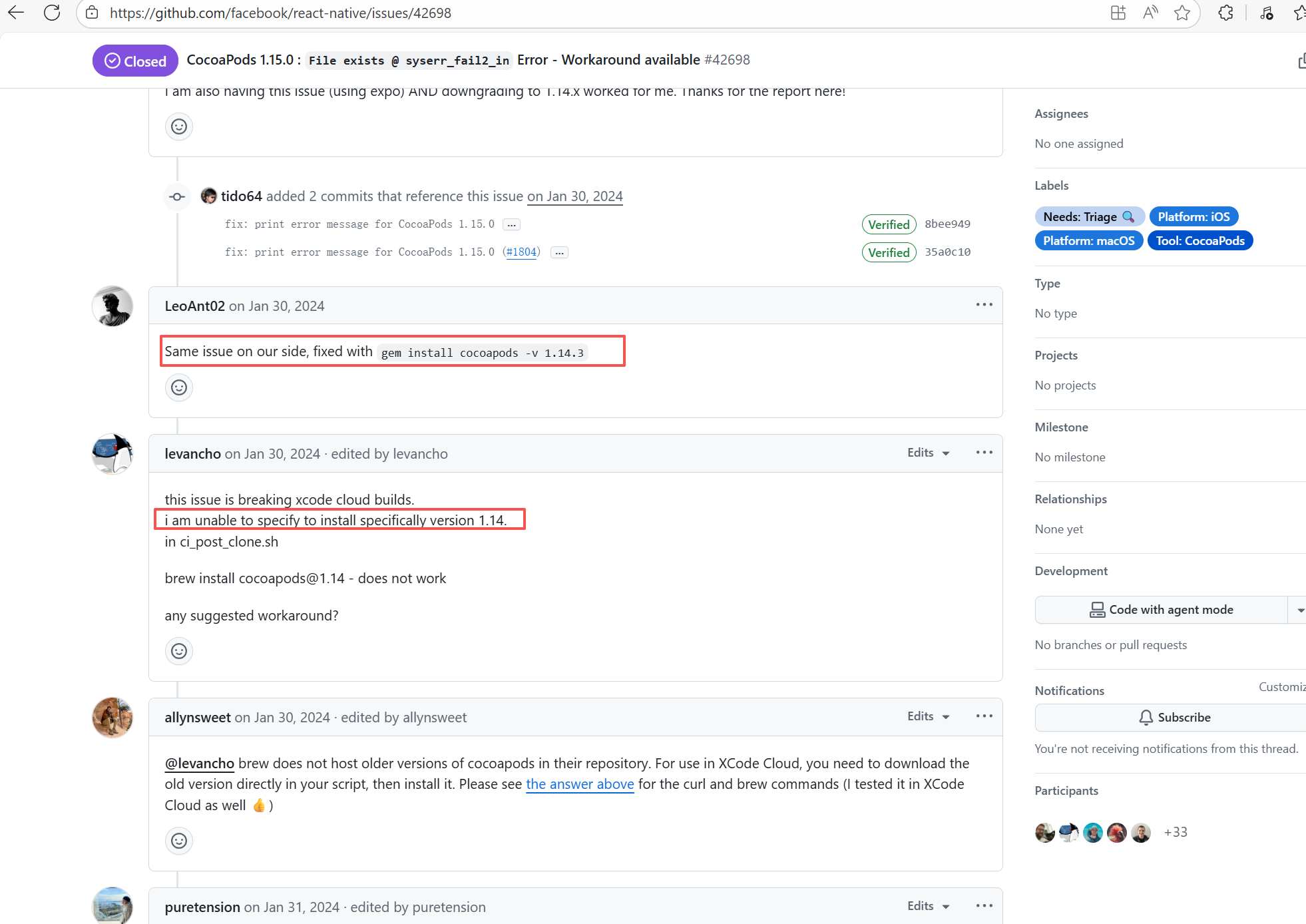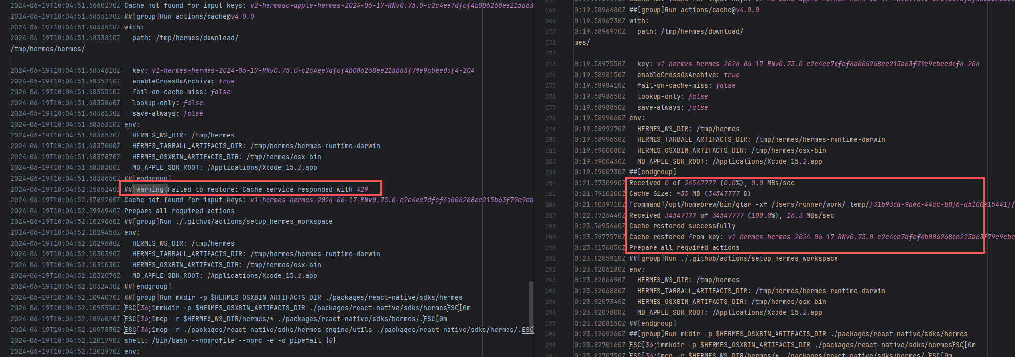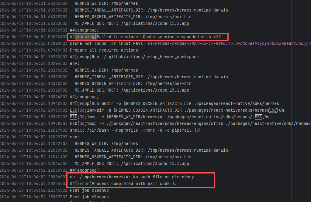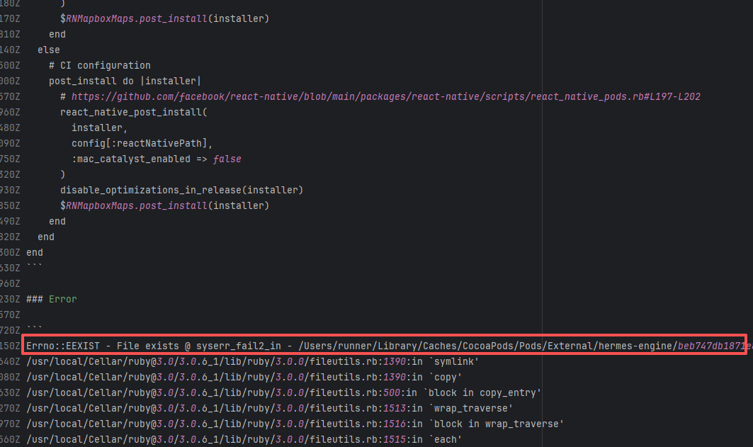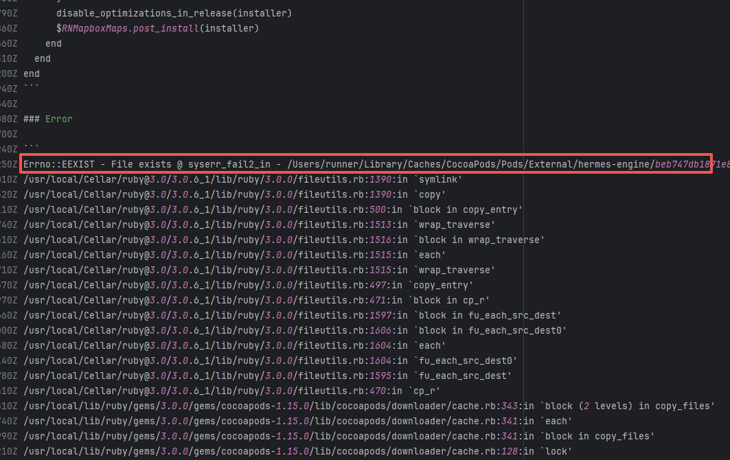 Error: This error occurs when installing hermes-engine, with error type Errno::EEXIST, meaning "File exists". This error is because a file or directory already exists in the cache directory, and the current operation attempts to create a file or directory with the same name, causing a conflict. Root Cause: By checking related Issues (https://github.com/facebook/react-native/issues/42698), this error occurs under CocoaPods version 1.15.0. It is not caused by a caching issue, but a bug in version 1.15.0. The only solution provided officially is to downgrade the CocoaPods version. The actual solution is to directly rerun, because the official macOS-last image was downgraded, and the CocoaPods version in the new image is 1.14.3. |