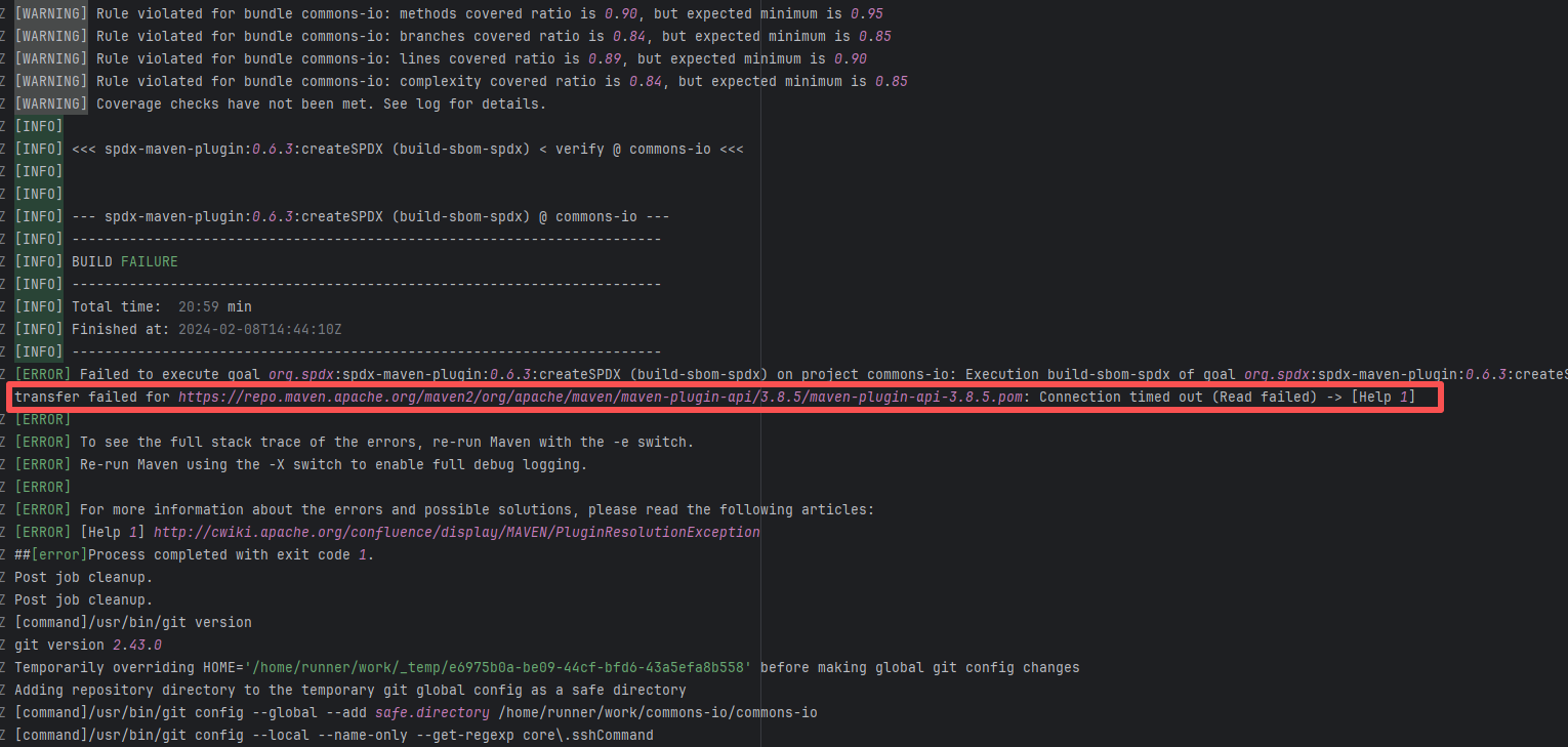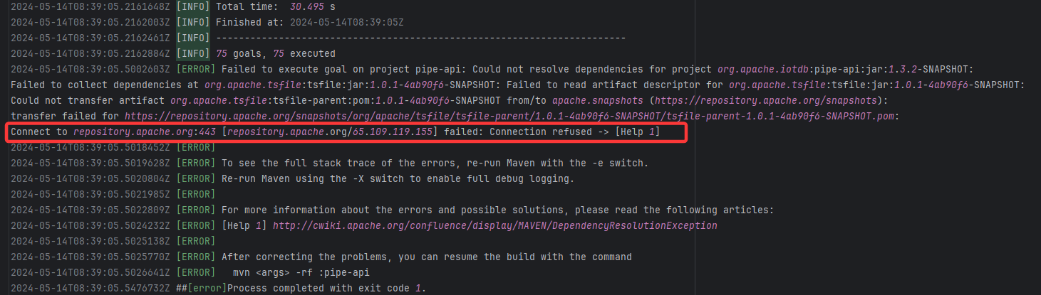 Error: Connection refused indicates that the build machine attempted to connect to the Apache mirror repository (repo Root Cause: The download operation was successfully executed after a rerun. |