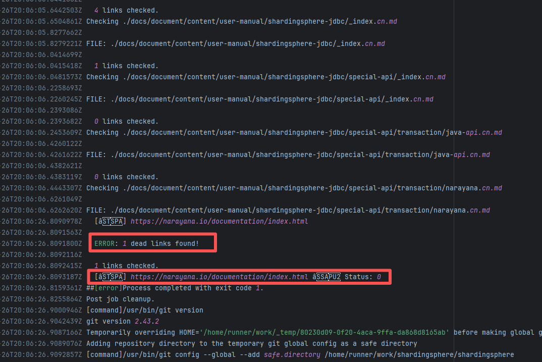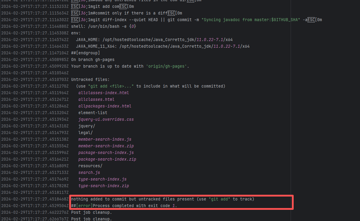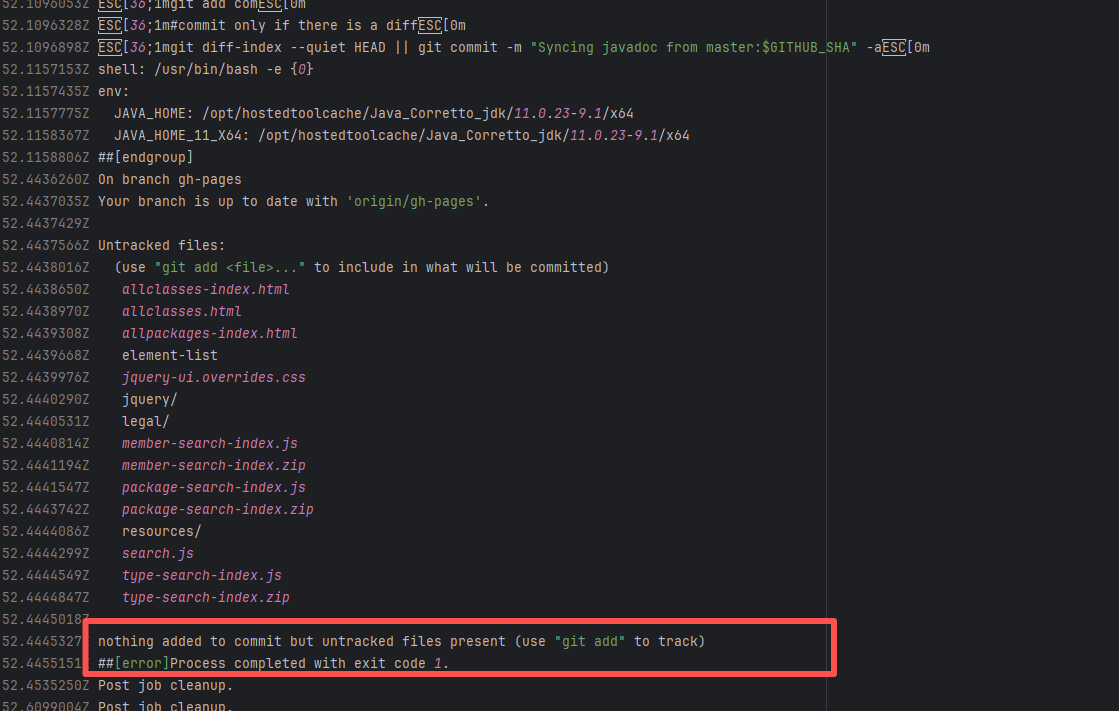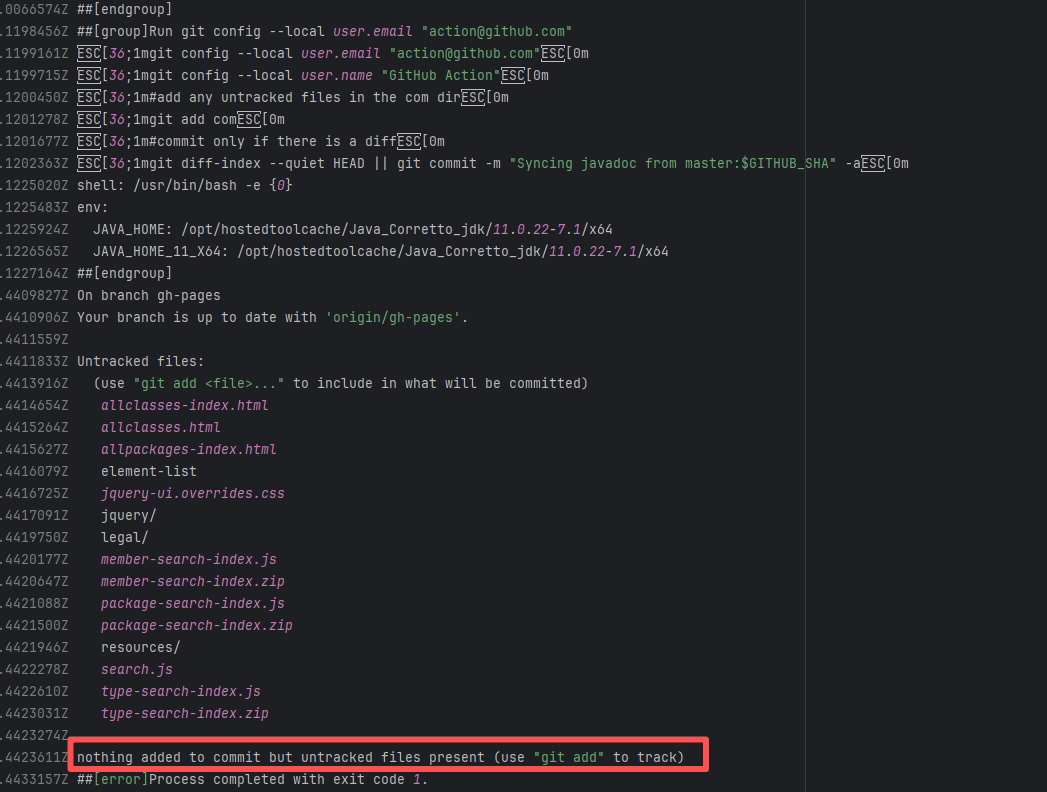 Error: The log error indicates that the `commit` command failed. The script only added the `com` directory, but there were files generated by `javadoc` in other directories. Because untracked files were detected, the execution failed during the commit. Root Cause: The action execution environment is a user's self-hosted server. The rerun succeeded after processing the relevant local files. |