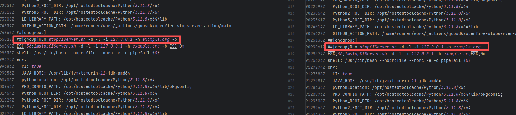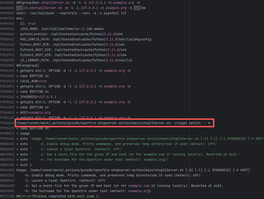 Error: The log shows that the stopCIServer.sh script received an unrecognized command line parameter -b during execution. Root Cause: Comparing the success and failure logs reveals that the error comes from an incorrect command in the action script. After using the latest action (the action script was modified and republished), the rerun succeeded. |