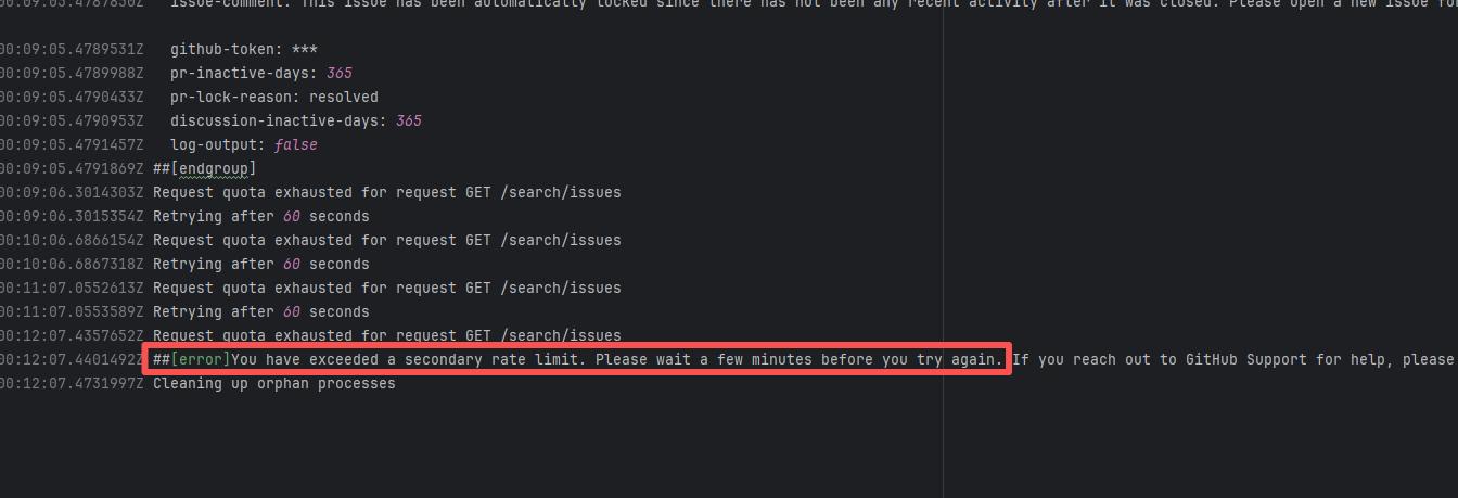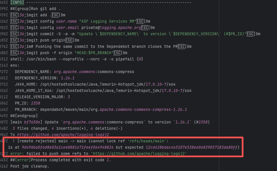 Error: The error message indicates a problem encountered when pushing the `main` branch to the remote repository. The reason is that the `main` branch on the remote repository has updates that the local repository does not. Specifically, the error message indicates that the remote `main` branch contains changes not present locally, triggering a reference lock conflict, resulting in the push being rejected. Root Cause: Log analysis reveals that the first run failed because new code was pushed to the remote repository while the action was running, causing a conflict during the push. During the rerun, because `git pull` was executed, the script obtained the latest state of the base branch, and thus the rerun succeeded. |