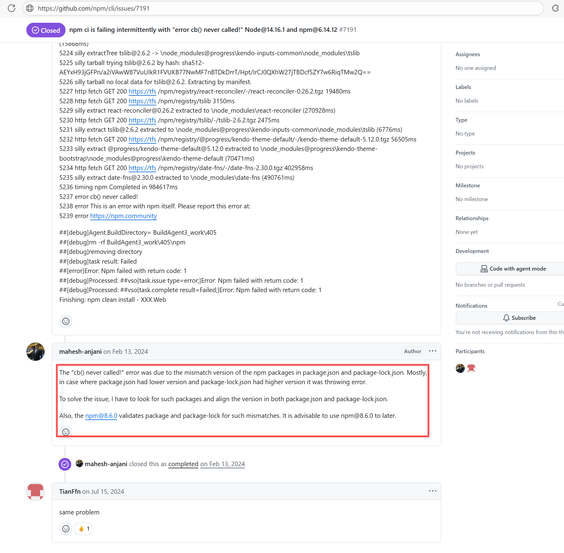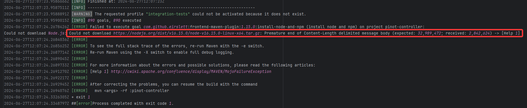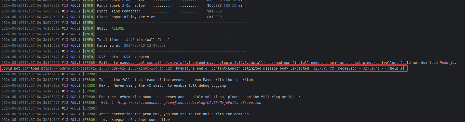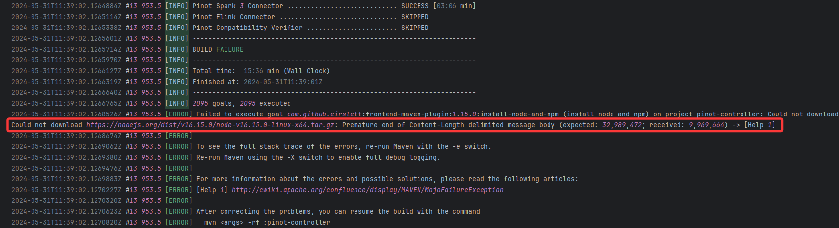 Error: Premature end of Content-Length indicates that while downloading the Node.js installation package, the net Root Cause: The download operation was successfully executed after a rerun. |