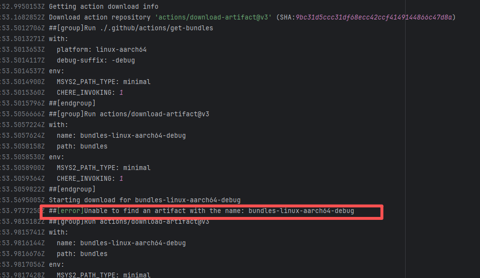 Error: The error message is "Unable to find an artifact with the name: bundles-linux-aarch64-debug", indicating that the download step could not find an artifact named bundles-linux-aarch64-debug, thereby causing the build to fail. Root Cause: Succeeded after a rerun, which indicates that the error is a transient error caused by network fluctuations. |