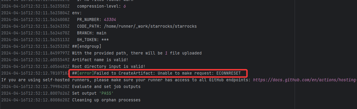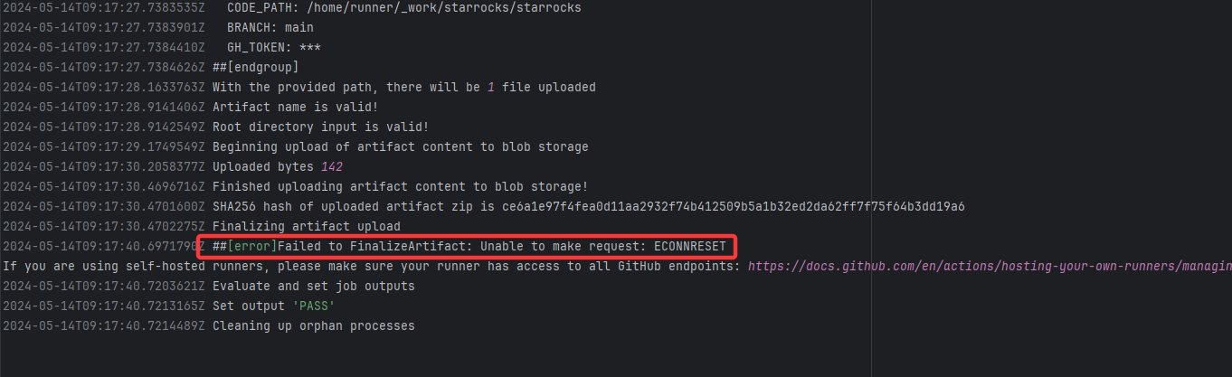 Error: ECONNRESET indicates that the Action attempted to upload the build artifact to Git Root Cause: The upload operation was successfully executed after a rerun. |