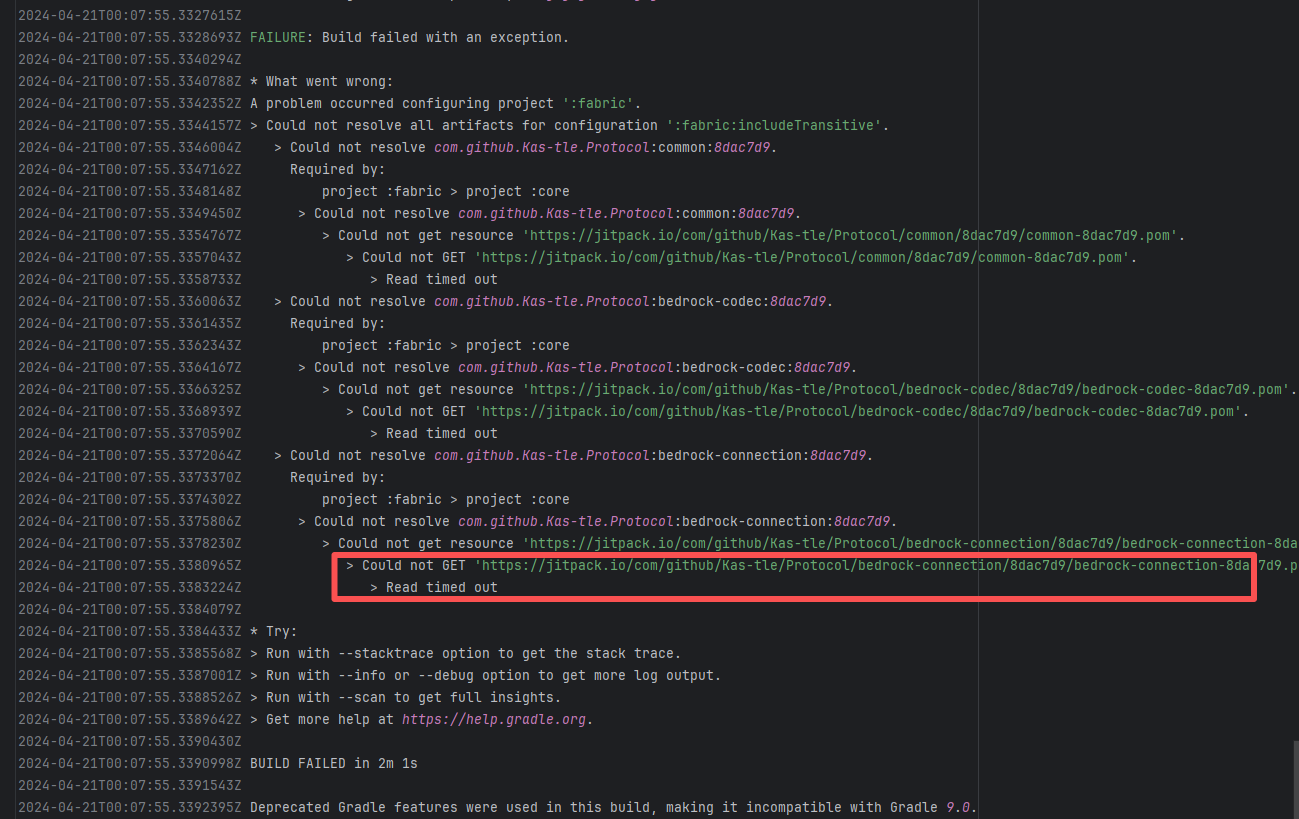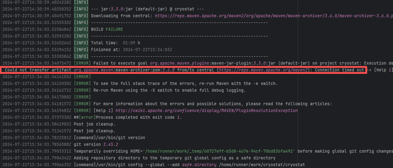 Error: An error occurred while fetching dependencies from the Maven repository, resulting in a Connection timed out error. Root Cause: Succeeded after a rerun. This indicates that the error was not a service provider server error, but a transient error caused by network fluctuations. |