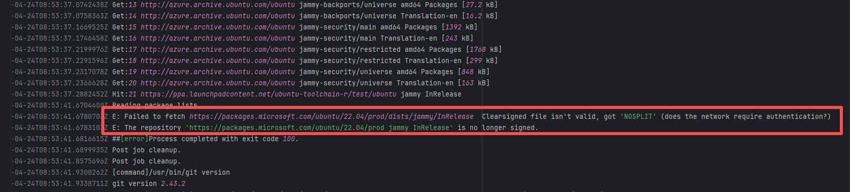 Short-term Fix: Rerun the job, which will automatically succeed after network conditions recover. Long-term Defense: - Continuously monitor the frequency of this error; - Introduce an automatic retry mechanism (e.g., using a retry plugin) in the Workflow for steps susceptible to network fluctuations; - If using a self-hosted Runner, troubleshoot the stability of the local firewall, proxy, or network egress. |