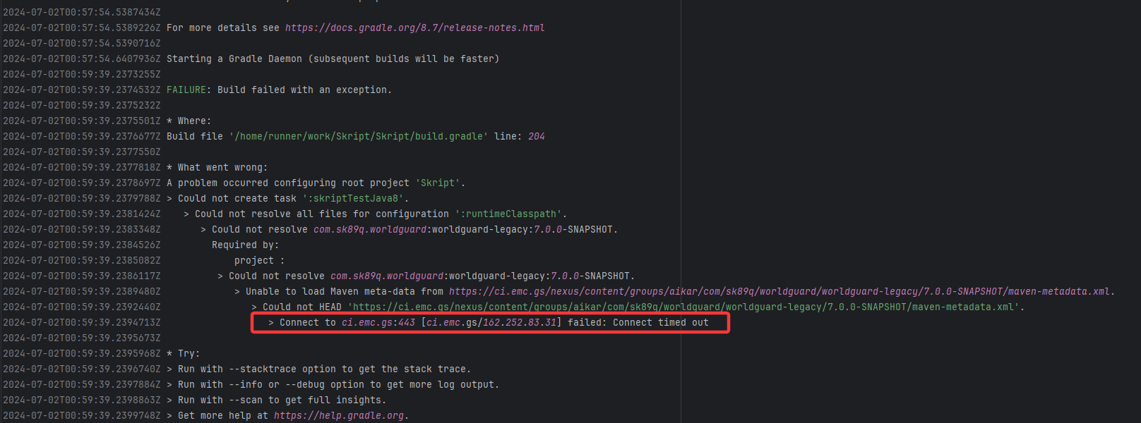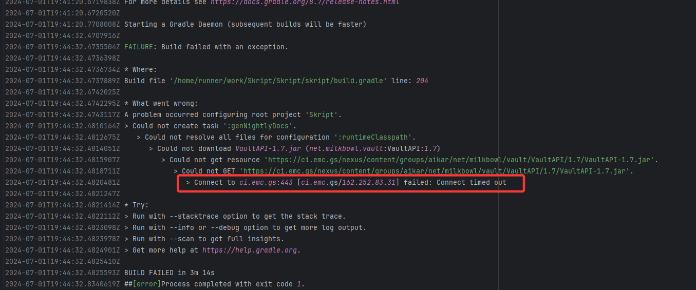 Error: Connect timed out indicates that the build tool (Gradle) attempted to fetch from an external Maven rep Root Cause: The download operation was successfully executed after a rerun. |